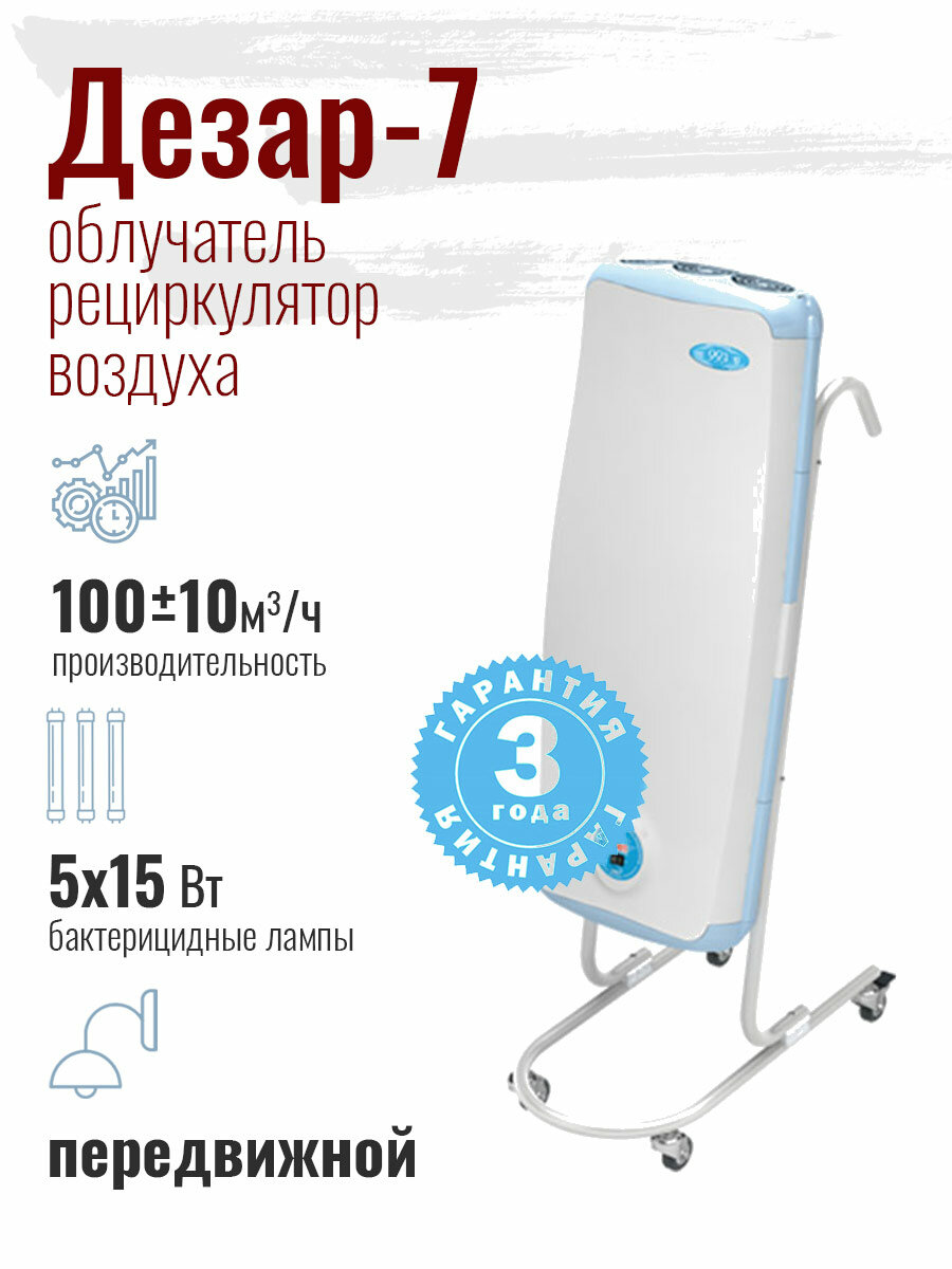 Дезар-7 – передвижной облучатель закрытого типа. Источник ультрафиолетового излучения – 5 безозоновых ламп TUV-15 с длиной волны 254 нм. Степень обеззараживания 99,9%. Производительность 100 м3 (кубических метров) в час. Степень обеззараживания – 99,9%. В качестве источника УФ-излучения в ДЕЗАР-7 используется 5 ламп TUV-15W (15Вт), на колбы которых нанесено особое покрытие, предотвращающее образование озона в процессе работы и увеличивающее время наработки на отказ до 9000 часов. Лампы генерируют УФ-лучи с длиной волны 254нм, излучение в таком спектре эффективно справляется практически со всеми микроорганизмами: бактериями, вирусами, грибками, спорами плесени. Особенную пользу несет применение такого оборудования в периоды развития эпидемий гриппа, острых респираторных и простудных заболеваний, дифтерии и прочих болезней, передача возбудителей которых осуществляется воздушным или воздушно-капельным путём. Другие особенности конструкции: