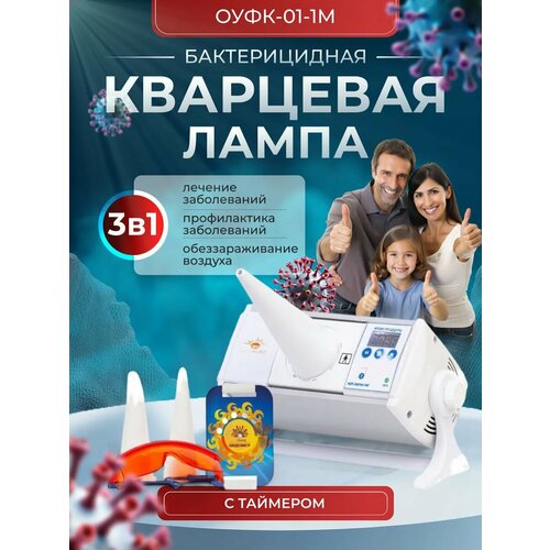 Кварцевая лампа бактерицидный рециркулятор солнышко для дома ОУФК 01 1 М. Облучатель ОУФк-01-1М предназначен для общих и внутриполостных локальных облучений при воспалительных заболеваниях в оториноларингологии в лечебных, лечебно-профилактических, санаторно-курортных учреждениях, а также в домашних условиях. Может быть использован при лечении как взрослых, так и детей старше 3 лет. Бактерицидный облучатель — это медицинское устройство, применяющееся для обеззараживания различных поверхностей и воздуха, с помощью ультрафиолетового излучения. Бактерицидная лампа помогает в борьбе с такими заболеваниями как: грипп, ринит, тубоотит, воспаление пазух, ларинготрахеит, фаринготрахеит, гнойные раны, тонзилит, астма, угри, бронхит, заболевания ЛОР органов и дыхательной системы! Вы можете применить кварцевую лампу как бактерицидный рециркулятор для обеззараживания и дезинфекции воздуха, при профилактике простудных заболеваний и не только! В приборе есть таймер для автоматического отключения прибора, благодаря чему вы можете устанавливать время для проведения конкретных процедур. В комплект к облучателю входят тубусы: с выходным отверстием под углом 60° для носа, с выходным отверстием Ø15 мм для полости рта, с выходным отверстием Ø5 мм для уха; очки для взрослого человека (очки для детей приобретаются отдельно); биодозиметр; заслонка; руководство по эксплуатации; инструкция по применению. В приборе используется лампочка ДКБУ-9. В случае применения прибора детям от 3-14лет время процедуры необходимо уменьшить в два раза. При повышенной температуре УФО не проводится. Все процедуры локального УФО проводятся с помощью тубусов, процедуры местного УФО проводятся без тубусов и со снятой заслонкой. Время установления рабочего режима изделия не превышает 1 мин с момента загорания лампы облучателя. Перед первым включением убедитесь, что лампочка вставлена до конца, при транспортировке она может отойти из цоколя.