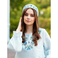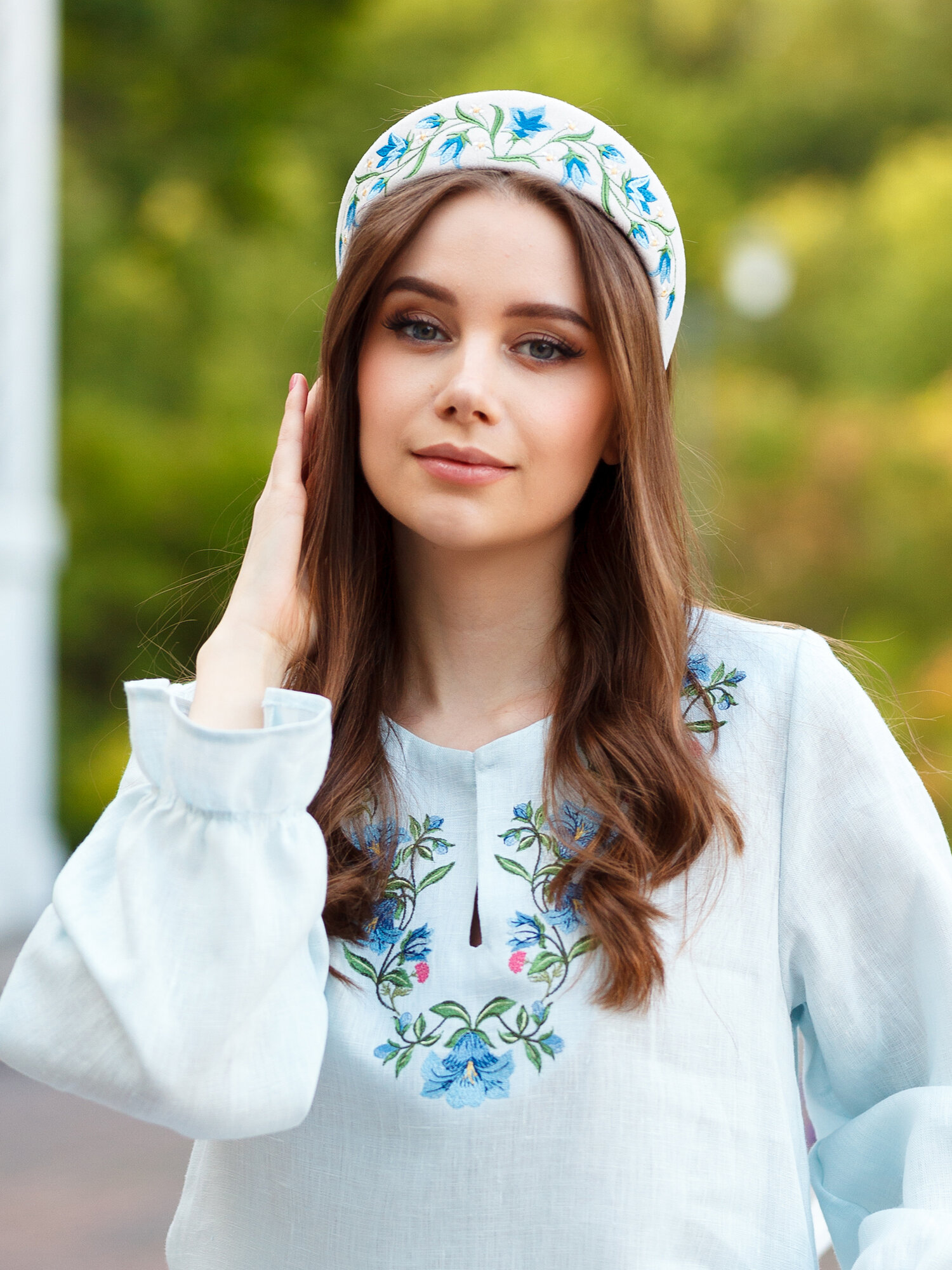 Ободок округлой формы декорирован вышитыми цветами колокольчиков на светло-бежевом фоне. Вышивка выполнена вискозными нитями по авторскому дизайну мастерской. Также в нашем магазине вы найдете Кокошник остроконечной формы с такой же вышивкой, артикул 5624664301