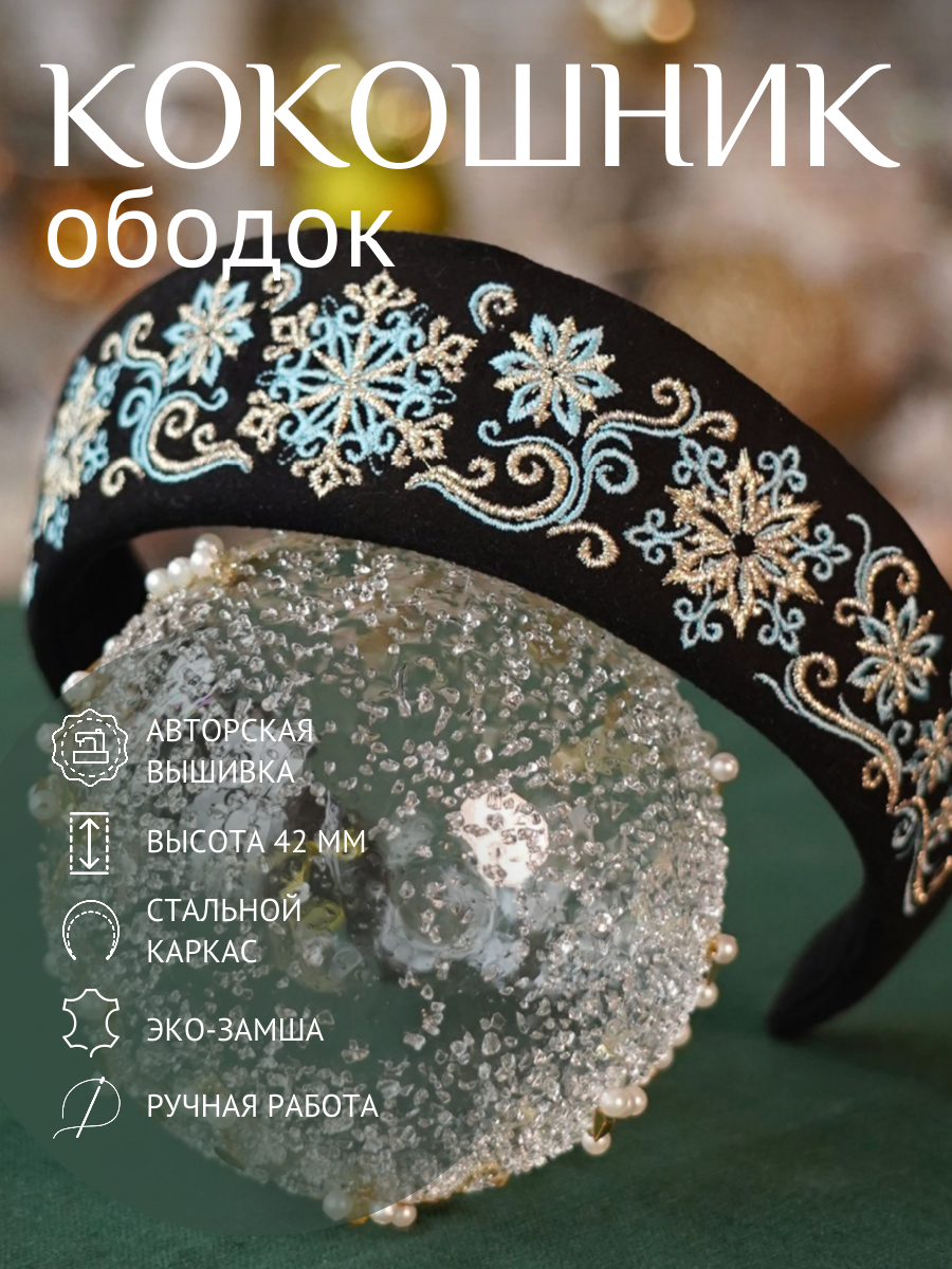 Ободок-кокошник Душенька с новогодней вышивкой – идеальный аксессуар для праздничного мероприятия. Изготовленный из мягкой искусственной замши, он придаст вашему образу элегантность и шарм. Ободок-кокошник с вышивкой подходит не только для русского народного стиля, но также прекрасно сочетается с современными нарядами.