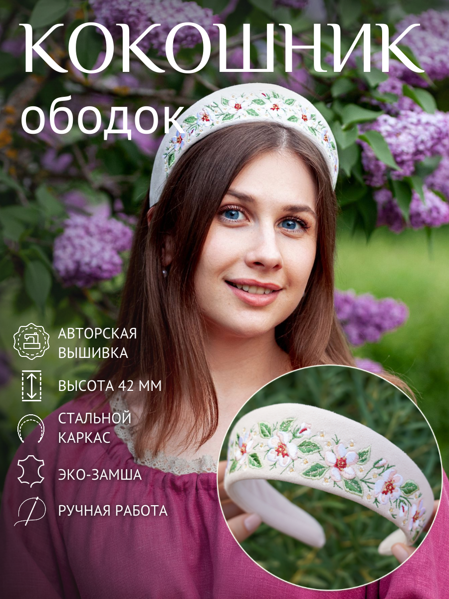 Ободок-кокошник Душенька – идеальный аксессуар для выпускного, свадьбы, корпоратива, похода в театр или любого другого праздничного мероприятия, а так же для повседневного использования. Изготовленный из мягкой искусственной замши, он придаст вашему образу элегантность и шарм. Ободок-кокошник с вышивкой подходит не только для русского народного стиля, но также прекрасно сочетается с современными нарядами.