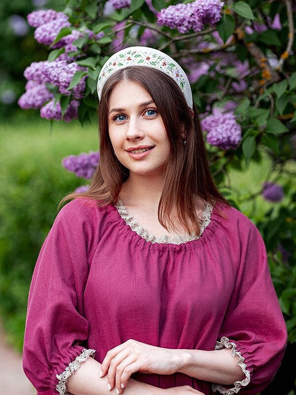 Ободок Душенька собирает волосы, создавая аккуратную прическу. Аксессуар ручной работы с машинной вышивкой. Внутри вставлен пластиковый каркас с металлической основой. Он держит форму, но при этом не давит на голову, что очень важно для многочасового использования.