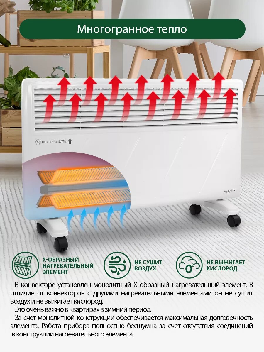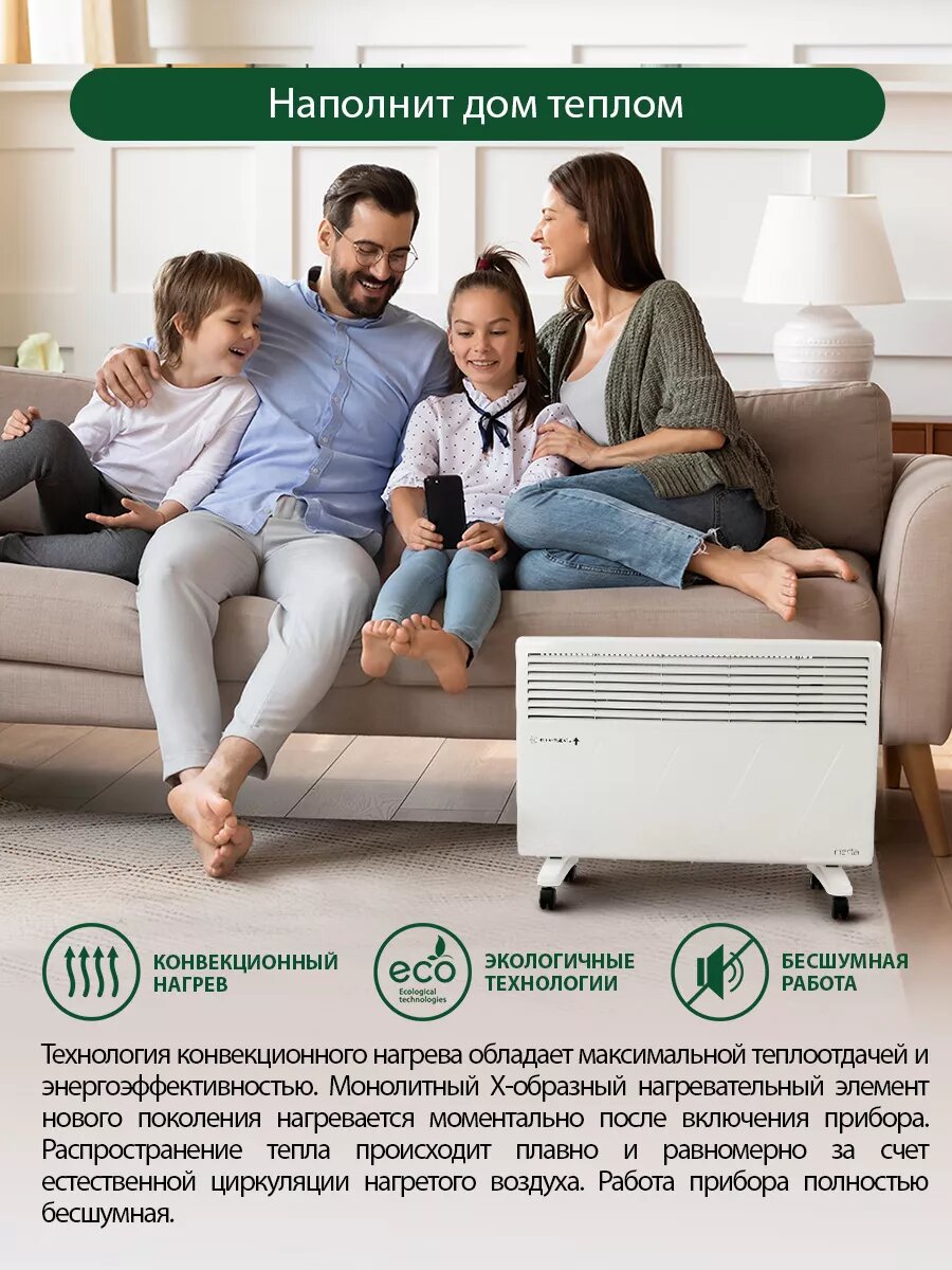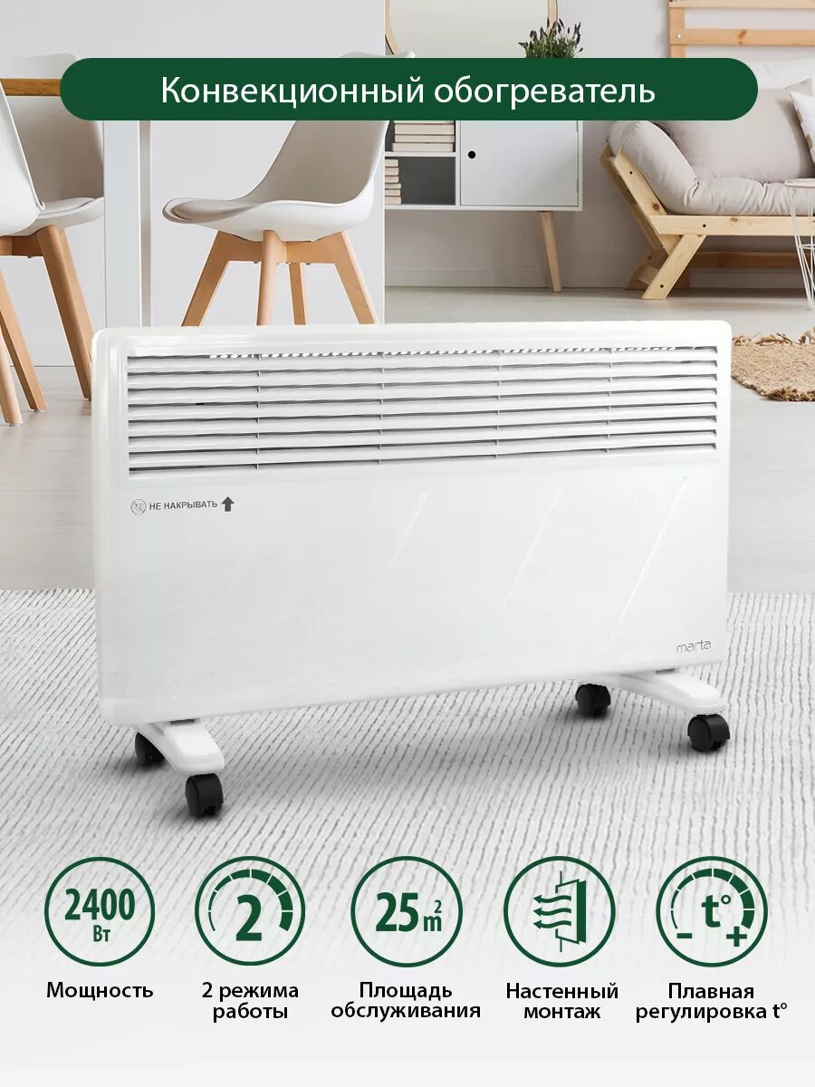 Конвекционный обогреватель, конвектор 2400Вт, 2 режима работы, регулируемый термостат, система защиты от перегрева, устойчивые ножки, настенное крепление в комплекте. Конвекционный обогреватель – это сочетание инновационных технологий, многолетнего опыта и смелого подхода в области климатической техники. Технология конвекционного нагрева обладает максимальной теплоотдачей и энергоэффективностью, по сравнению с обогревателями других типов. Игольчатый нагревательный элемент нового поколения нагревается моментально после включения прибора. Распространение тепла происходит плавно и равномерно за счет естественной циркуляции нагретого воздуха. Прибор работает абсолютно бесшумно. Для обогрева помещения разной площади и желаемой скорости нагрева доступно 2 режима мощности: . I - для плавного нагрева и поддержания тепла. II – для быстрого нагрева холодного помещения. Высокоточный термостат автоматически поддерживает комфортную температуру в помещении на заданном уровне. Обогреватель при необходимости может быть закреплен на стену, для этого в комплекте предусмотрены специальные крепления. Такой способ монтажа поможет сэкономить место и создать эффект настоящей отопительной системы. Продуманная конструкция ножек поможет надежно установить прибор на полу и исключит опрокидывание, даже если его нечаянно толкнуть. Не масляный обогреватель, конвектор напольный для дома, обогреватель настенный для дачи, не радиатор в офис, отель, не масляник для гостиниц, не тепловентилятор в подарок на новый год, обогреватель на подарок бабушке на 8 марта, конвекционный обогреватель керамический для комнат, конвектор настенный для турбаз. Отлично подойдет для использования дома, на даче или в офисе. Подходит для отелей, гостиниц, гостевых домиков, турбаз. Отличный подарок на новый год, 8 марта, новоселье!