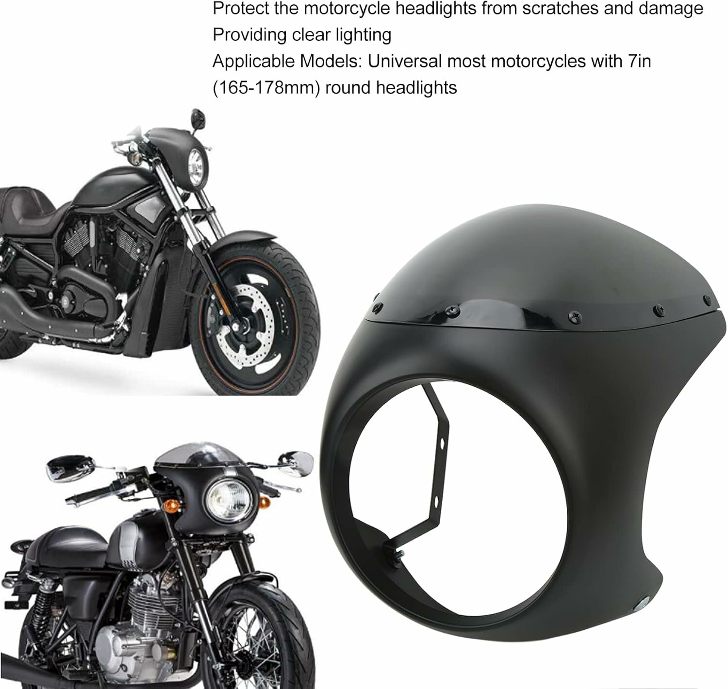 1. Применимо: Обтекатель фары мотоцикла универсален для большинства мотоциклов, оснащенных круглыми фарами диаметром 7 дюймов.