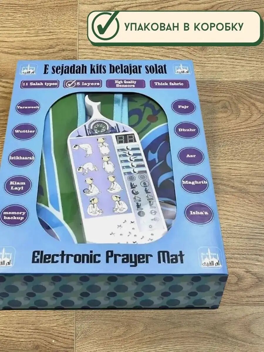 Электронный интерактивный сенсорный обучающий коврик для намаза. Благодаря этому коврику можно научить ребенка молитве с 3-4 лет в игровой форме. На коврике есть специальные отметки для ладоней и ступней, чтобы он реагировал на движения в молитве и поклоны. 36 интерактивных клавиш (функций) полностью обучат словам, необходимым для молитвы. Обучает на шести языках: турецкий, английский, русский, арабский, французский, малайский. Использование интуитивно понятных сенсорных клавиш позволяет выбирать для обучения разные виды обязательных и дополнительных молитв - фаджр, зухр, аср, магриб, иша, таравих и тд. Датчики положения молящегося указывают на имеющиеся ошибки в намазе. Встроенный компас позволяет определить Киблу (направление в сторону Каабы). Учит делать дуа после намаза, зикр. В изготовлении использованы водонепроницаемые материалы. Питание от батареек 1,5VхAA - 3 шт. Они не входят в комплект! Коврик упакован в коробку с ручкой - то есть отлично подойдет на подарок: для девочек, для мальчиков. Прекрасный вариант первой детской электроники. Размер коврика 100*60 см, идеально впишется в любой интерьер, не занимая много места. Подойдет в качестве подарка мусульманам на рамадан, ид аль фитр, ид аль адха, курбан байрам, ураза байрам.