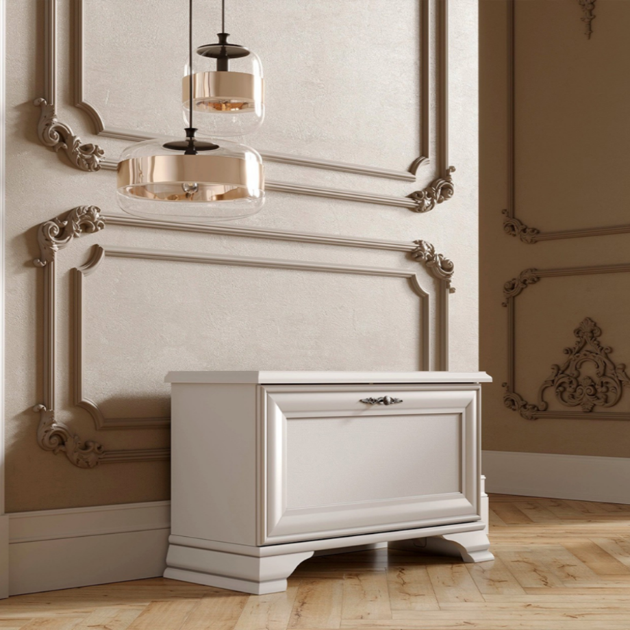 Тумбочка шириной 80 см, высотой 50 см и глубиной 35 см не займет большого пространства и поможет организовать уютный уголок для хранения домашних тапочек и строгих туфель. Заломы и вмятины на обуви не остаются. Строгий вид и лаконичная отделка позволит вписать ее в классический, неоклассический и современный интерьер.