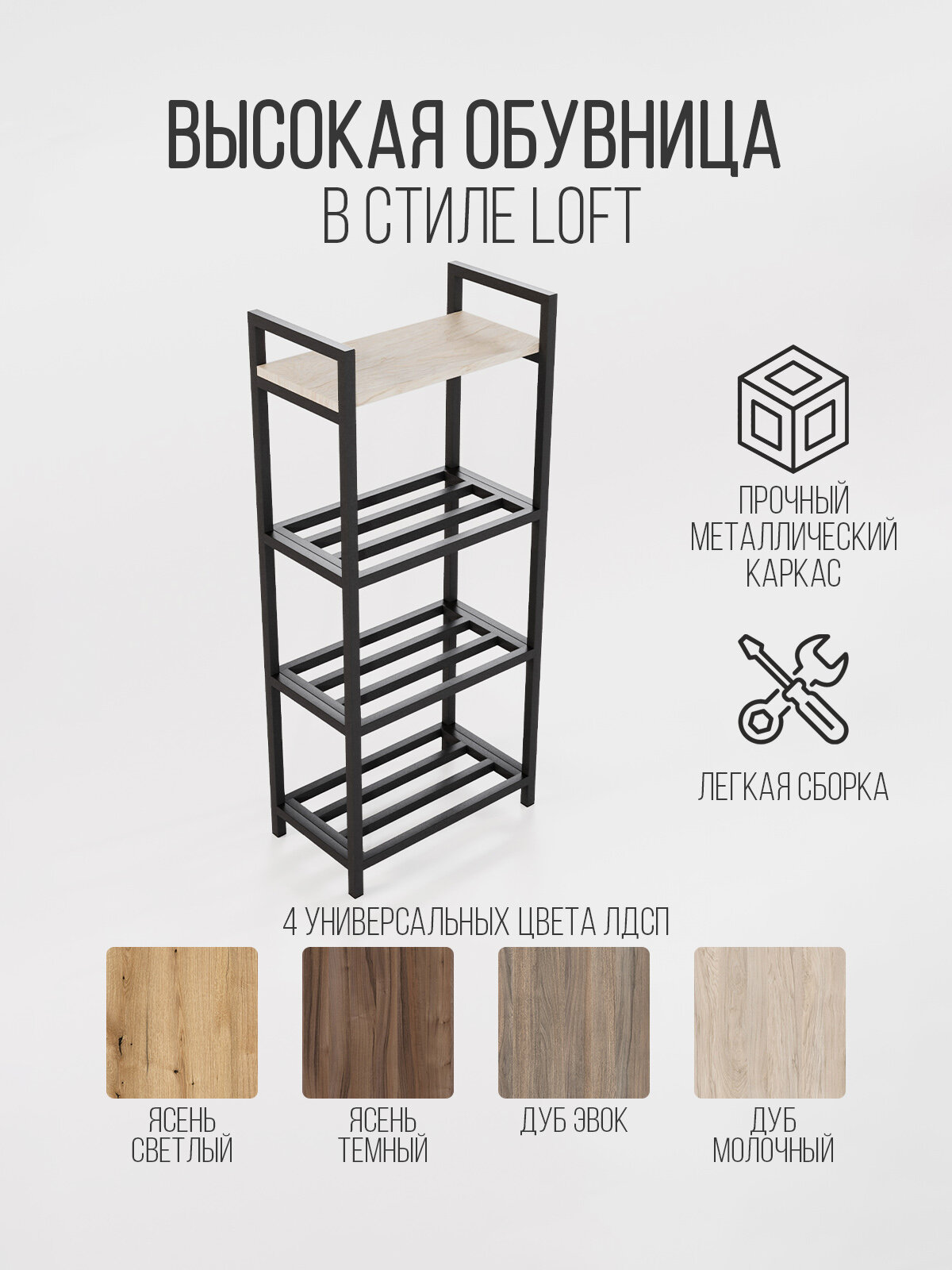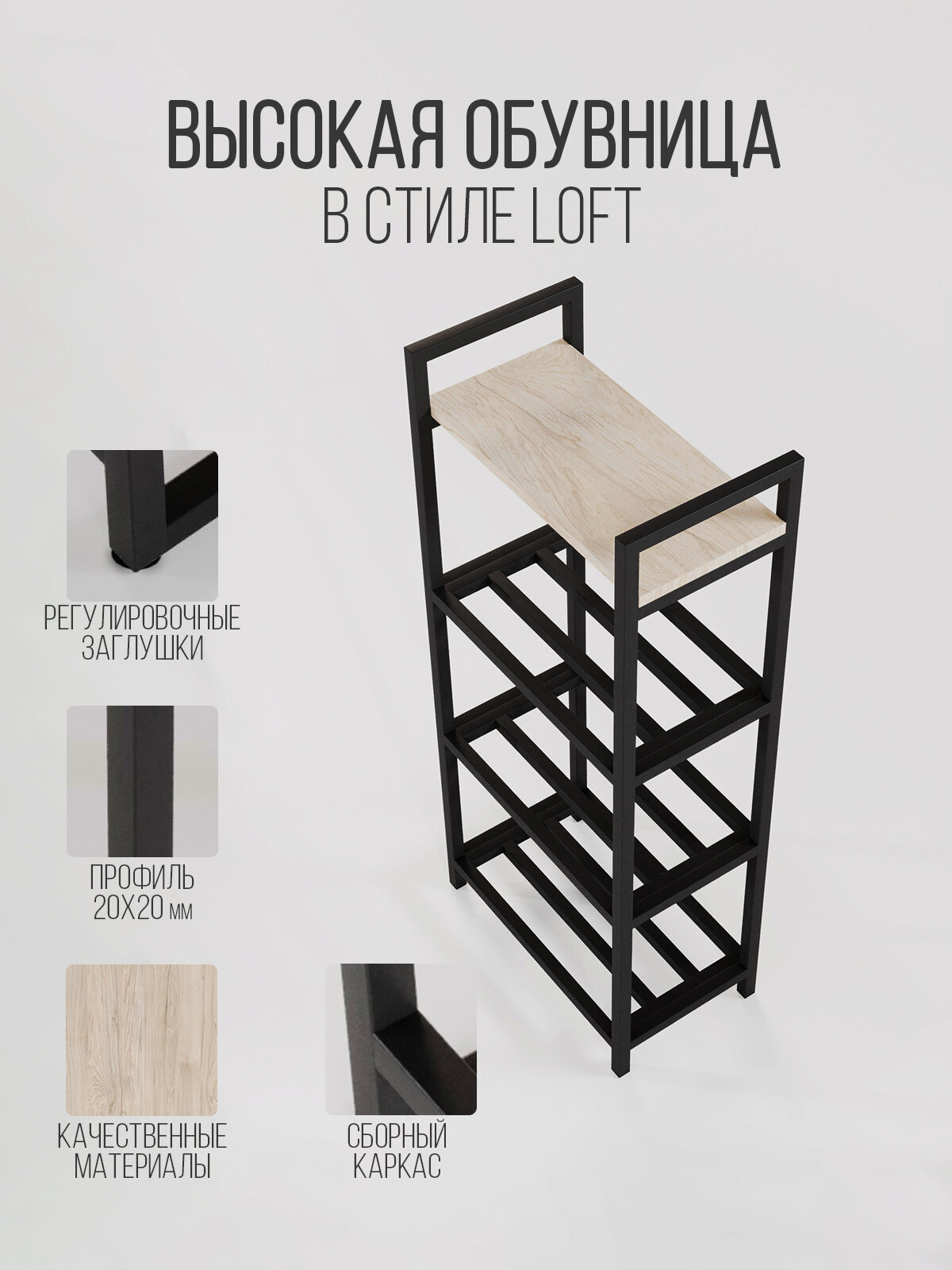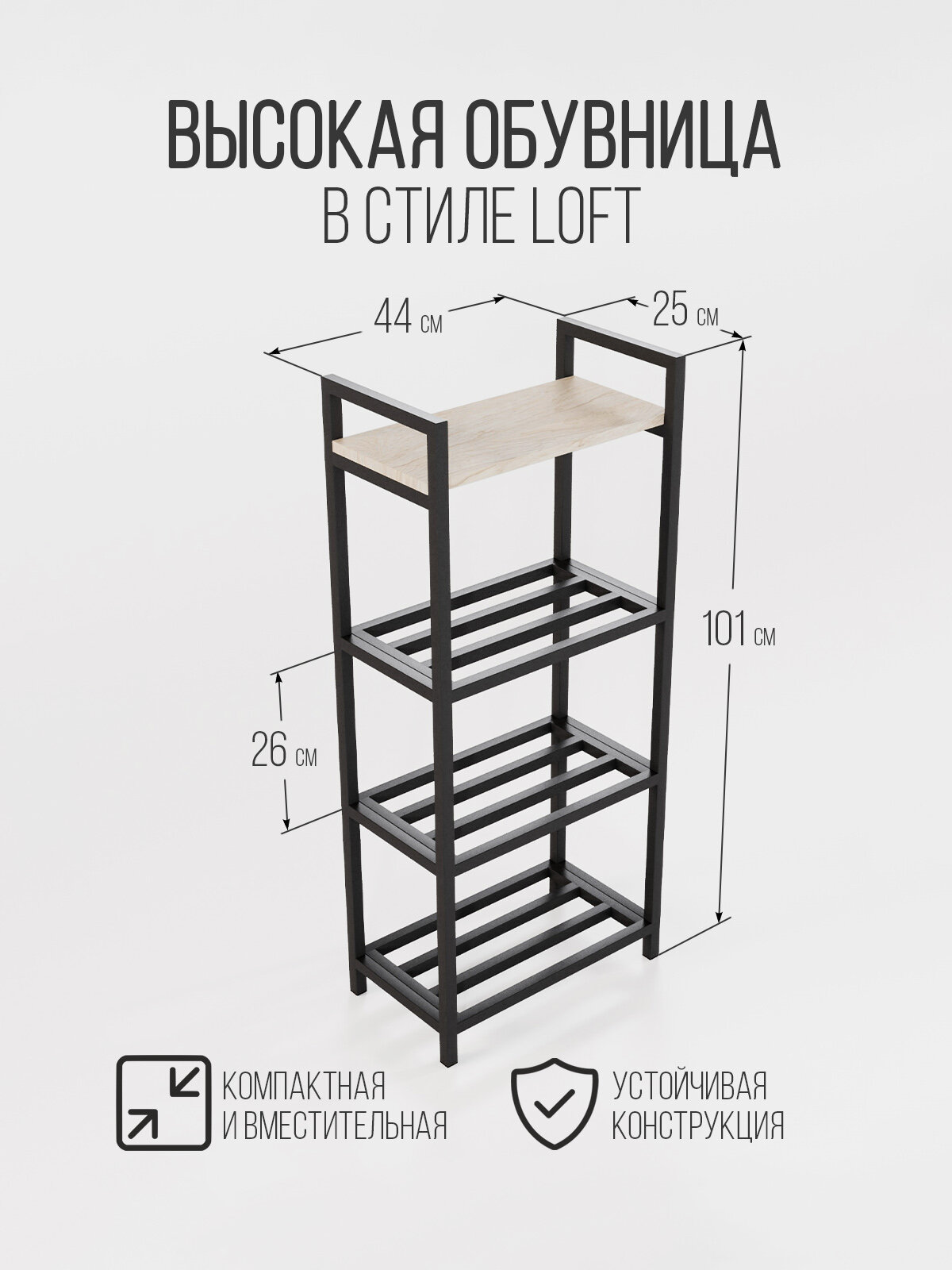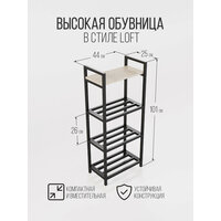 Обувница выполнена из прочного металлического каркаса и ЛДСП полки, что обеспечивает надежность и долговечность.