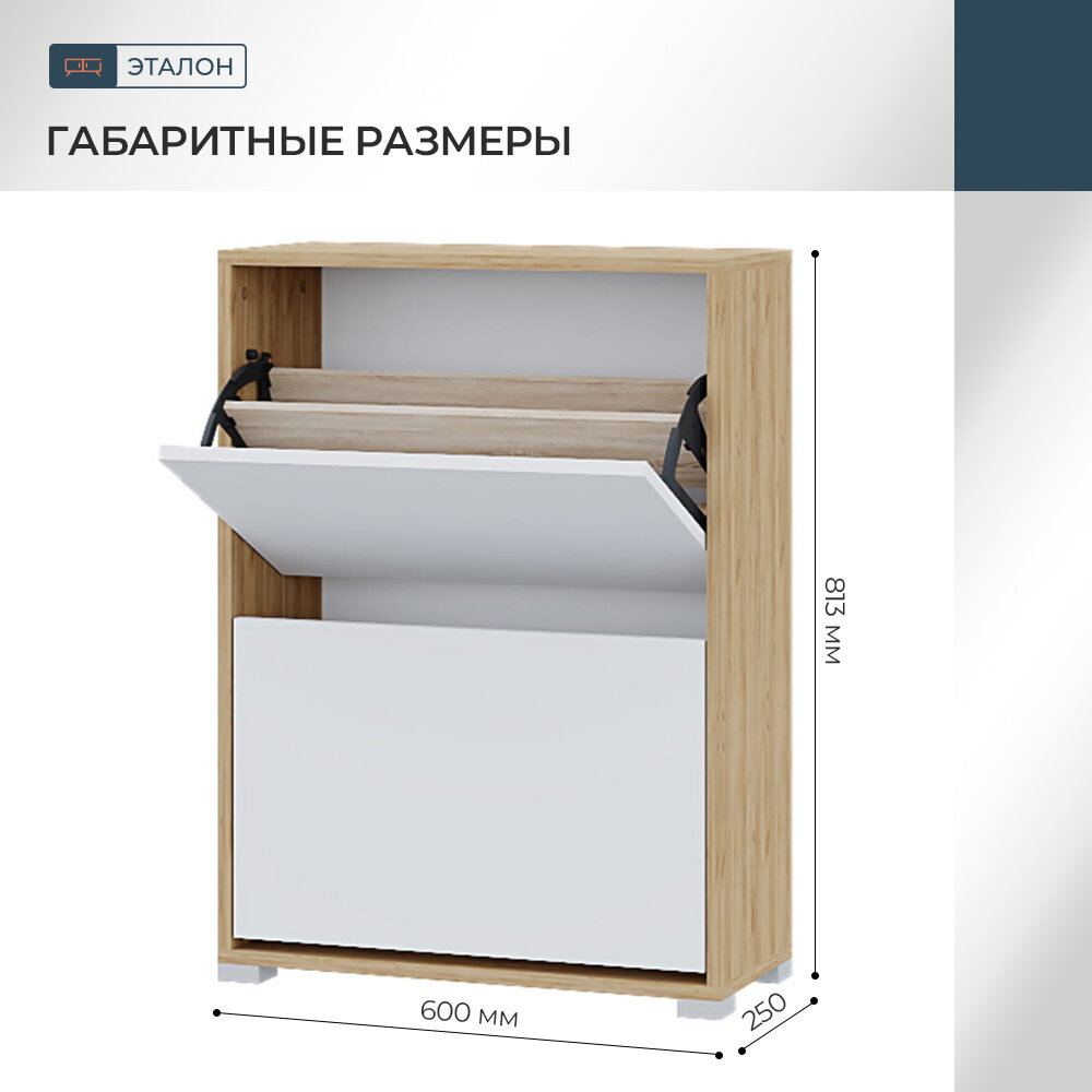 - Стильный дизайн: сочетание цветов "Крафт золотой/Белый" придает обувнице особый шарм. - Прочность и долговечность: корпус и фасад выполнены из экологически чистого материала, который обеспечивает долговечность мебели. - Удобство хранения: две закрытые секции позволяют удобно хранить обувь, не занимая много места. - Компактные размеры: обувница имеет компактные размеры, что позволяет разместить ее даже в небольшом помещении. -Практичный дизайн впишется в любой интерьер: классический, лофт, скандинавский стили. -Быстрая сборка.