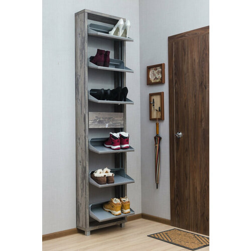 Узкая форма делает её идеальным выбором для компактных помещений. Эта подставка для обуви в прихожую не только экономит место, но и дополняет общий стиль интерьера, интегрируясь в стенку. Её практичность заключается в двух секциях, каждая из которых обеспечивает компактное размещение ваших туфель и ботинок.