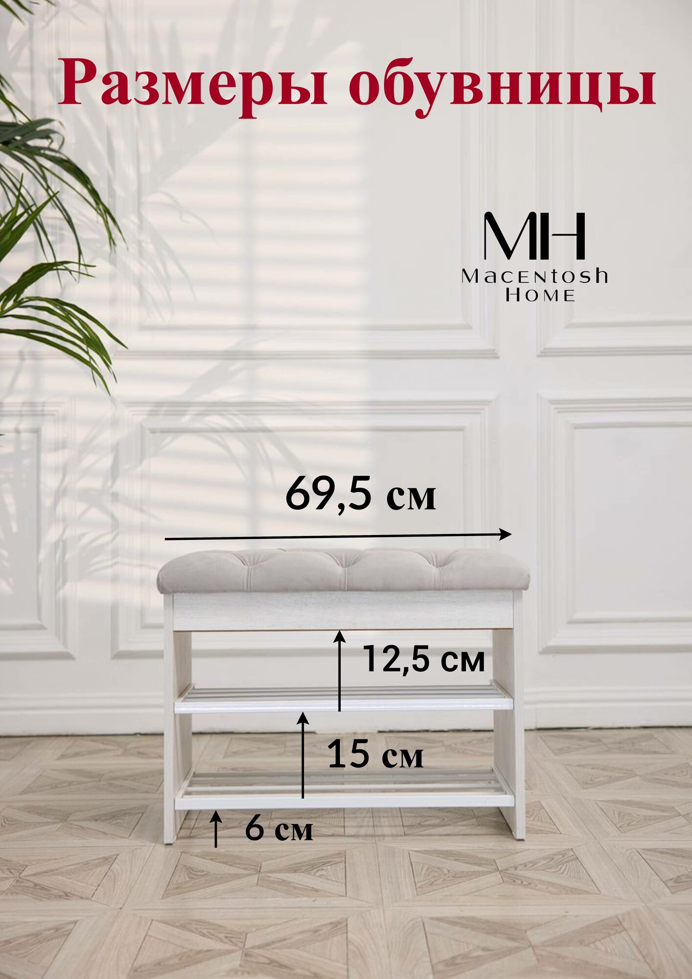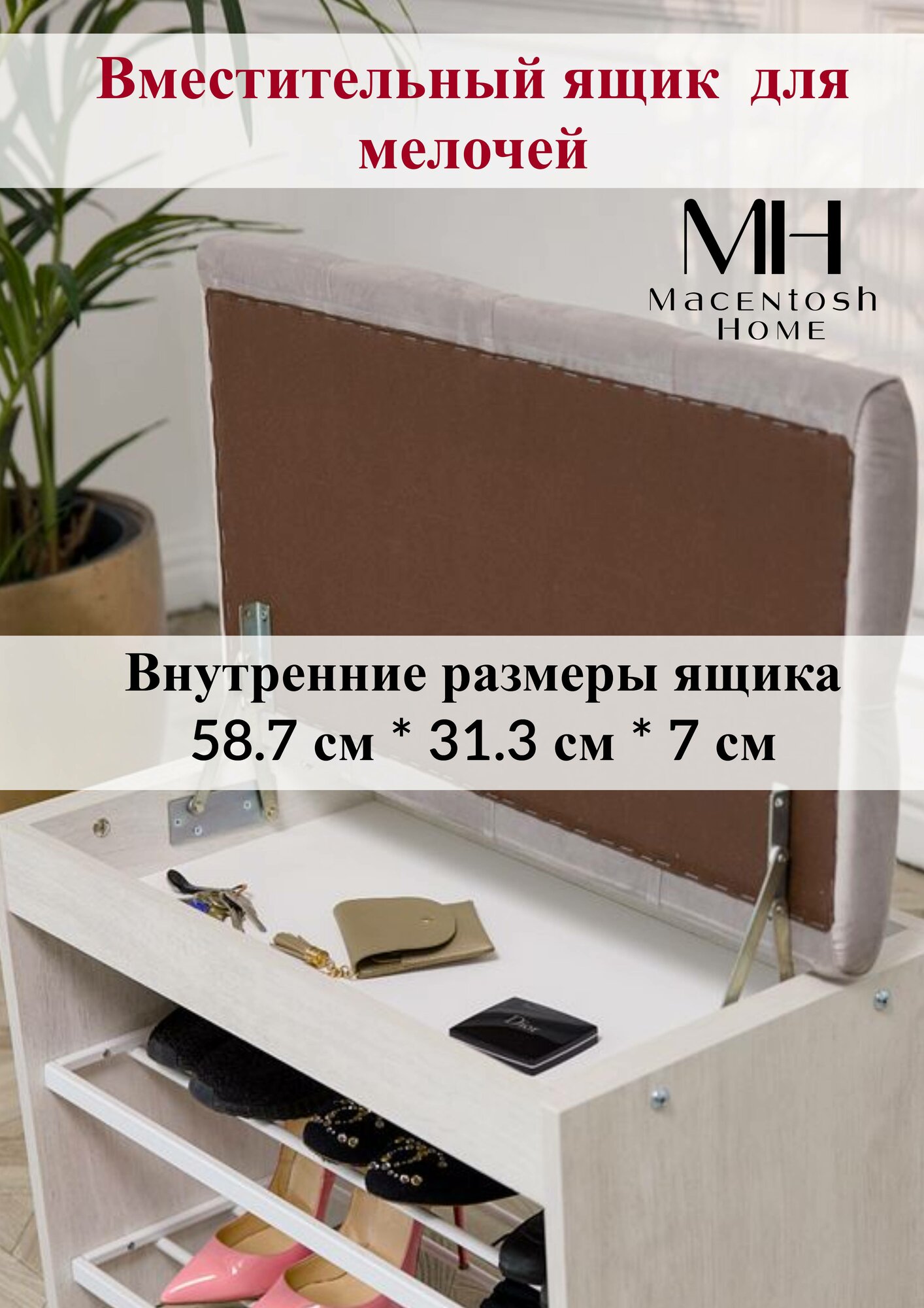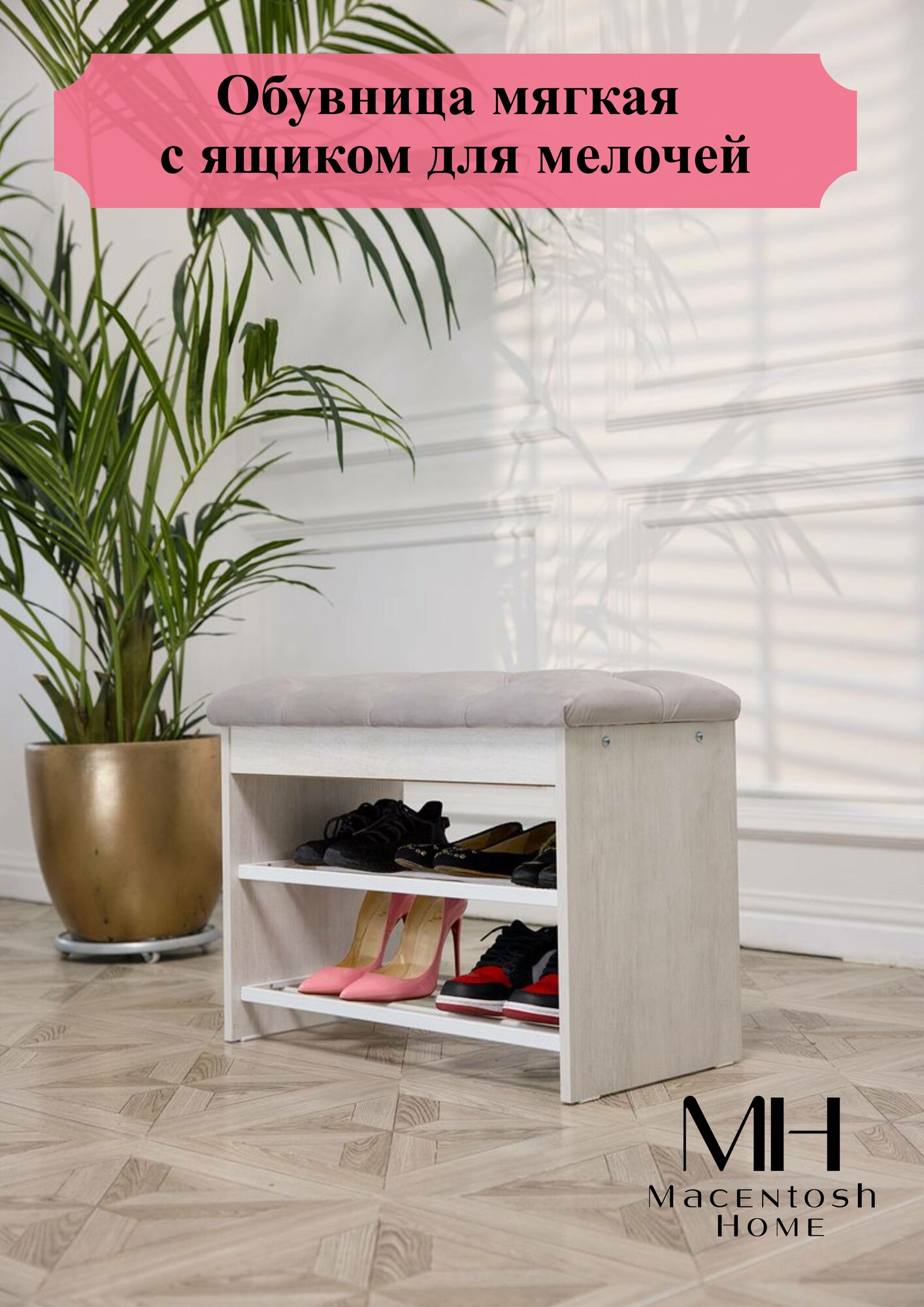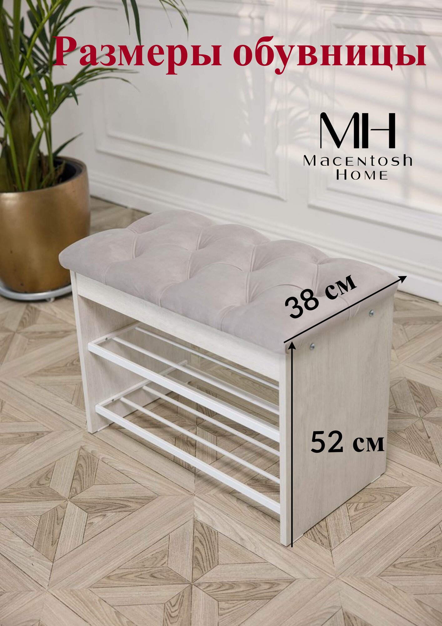 Обувница, этажерка для обуви с сиденьем, скамья или галошница - отличный вариант для хранения обуви и повседневных вещей, а также удобный варианта для коридора, чтобы присесть, снять обувь и расположить ее на металлические полки. Вместительный ящик для хранения можно поместить аксессуары для обуви, зонт, ключи и любую другую мелочь. Компактные форма и размеры позволяют поставить обувницу не только в прихожей, но и в узком коридоре и на балконе, а также в гардеробной комнате и холле. Металлические полки для обуви это незаменимый предмет интерьера в квартире, в бане или на даче, который можно использовать в качестве банкетки, пуфика с ящиком для хранения в коридоре мелочей, документов, средств для ухода за обувью. Прочное сиденье с каретной стяжкой из приятного велюра у открытой обувницы обеспечит вам комфортное переобувание в гардеробной. Наши изделия подходят для интерьеров стиле лофт, классическом, современном, модерн. Полочки для обуви из металла с антикоррозионной порошковой покраской с защитой от влаги белого цвета и коричневого цвета представлены в трех цветах. Так же у нас вы можете приобрести в комплект и другую деревянную мебель в прихожую: зеркало настенное, тумбу узкую, тумбу комод в прихожую под обувь (для обуви подставка) без мягкого сиденья, напольная вешалка, навесную вешалку. И у вас получится роскошный комплект в прихожую, но в современном стиле минимализм, лофт. Станет отличным подарком маме, папе, бабушке, дедушке, свекрови, другу и подруге на новоселье, день рожденье, или без повода порадовать дорогих людей. Наши изделия подходят для интерьеров стиле лофт, классическом, современном, модерн, минимализм. Ножки и ящик у обувницы выполнены из качественного ЛДСП, полки из металла, а мягкое стеганное сиденье из роскошного и приятно велюра, который вы можете прочистить губкой или легкой влажной уборкой. Обувница стеганая с мягким сиденьем имеет следующие размеры: длина 695 мм, высота 520 мм, глубина 380 мм. Обувница с ящиком приходит в разобранном виде, но благодаря инструкции и всем необходимым креплениям ее очень легко собрать. С такой обувницей любая прихожая станет стильной, незабываемой. Кроме того, наша мебель прослужит Вам долго благодаря нашему особому подходу при создании и производстве мебели только из натуральных и качественных компонентов, чтобы дизайн и функциональность изделий были на высшем уровне по доступной цене. Наша мебельная фабрика и бренд Macentosh Home станет лучшим другом и приятным дополнением к Вашему дому.