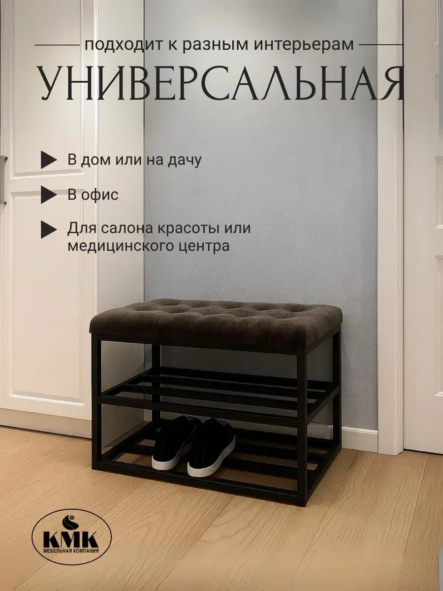 Обувница / этажерка / банкетка с мягким сиденьем в прихожую для обуви в каретной стяжке на металлическом каркасе выполнена в стиле Лофт. Размеры: ширина 61см, высота 46см, глубина 36см Расстояние между полками - 20 см Толщина трубы - 2х2 см Толщина сиденья - 6 см . Изготовлена из прочного металлического каркаса, который покрыт полимерно-порошковой краской. Конструкция имеет 2 полки, что очень удобно для расположения обуви всех сезонов. Сиденье мягкое, выполнено в каретной стяжке с поролоном. Ткань не требует особого ухода, - достаточно протереть ее влажной тряпкой. Обувница идеально подойдет в прихожую, гардеробную, офис, беседку, котельную, предбанник. Подходит для детской и взрослой обуви. Наша обувница - удобный и функциональный элемент интерьера. Также, наша продукция станет отличным подарком к любому празднику: на День Рождения бабушке, или к юбилею дедушки, любимой маме, на Новый год, на 8 марта, на 14 и 23 февраля. Мы заботимся о наших покупателях, поэтому обувница поставлется в собранном виде, не требует сборки. Будем рады видеть Вас среди наших покупателей.
