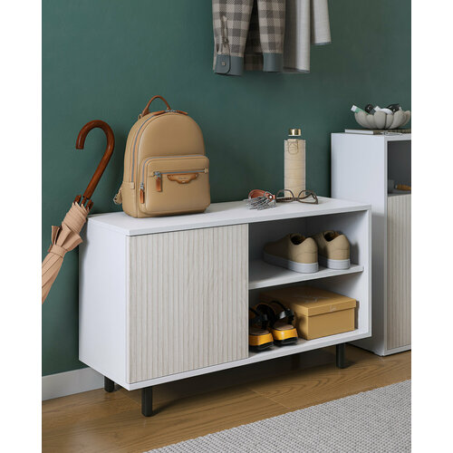 Регулируемые опоры выполнены из металла черного цвета. Тумба оснащена несколькими ярусами для размещения различных видов обуви, что позволяет эффективно использовать пространство.