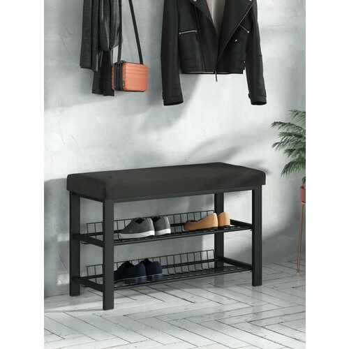 Небольшая обувница с сиденьем с стиле лофт предназначена для аккуратного и эргономичного хранения обуви в прихожей или коридоре. Банкетка сочетает в себе преимущества этажерки для обуви и мягкого сиденья: на 2-х уровнях обувницы предусмотрено место для 6-8 пар обуви, а благодаря мягкому сиденью вам будет удобно надевать / снимать обувь или поставить сумки. Узкая обувница отлично впишется в любую прихожую, даже небольшую. Размер сиденья: длина 81 см, ширина 32 см, высота 51 см. Расстояние между обувными полками 17 см. Каждая полочка имеет ограничитель, благодаря чему обувь не будет пачкать стены. Расстояние от пола до нижней полки позволяет разместить под обувницей поддон для обуви для защиты пола от грязи. Ножки банкетки с защитой для пола предотвращают появление царапин. Благодаря прочному металлическому каркасу обувница выдерживает нагрузку до 200 кг. Полка для обуви с сиденьем стильно смотрится, очень удобна в использовании и занимает минимум места.