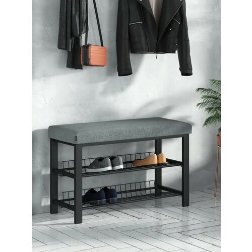 Обувница - банкетка в стиле лофт предназначена для аккуратного и эргономичного хранения обуви. На двух уровнях этажерки предусмотрено место для 6-8 пар, а на мягком сиденье удобно обуваться и разуваться или поставить сумки. Обивка изготовлена из плотного, устойчивого к потертостям материала. Благодаря прочному металлическому каркасу обувница выдерживает нагрузку до 200 кг. В отличие от конструкций из ДСП окрашенный металл не подвержен разрушению и набуханию от влаги. Ножки с защитными заглушками предотвращают появление царапин. Каждая полочка имеет ограничитель, благодаря чему обувь не будет пачкать стены. Расстояние от пола до нижней полки позволяет поместить подставку для защиты от грязи. Похожая на скамейку обувница отлично впишется в любую прихожую, даже небольшую и узкую. Стильно смотрится и удобна в использовании.