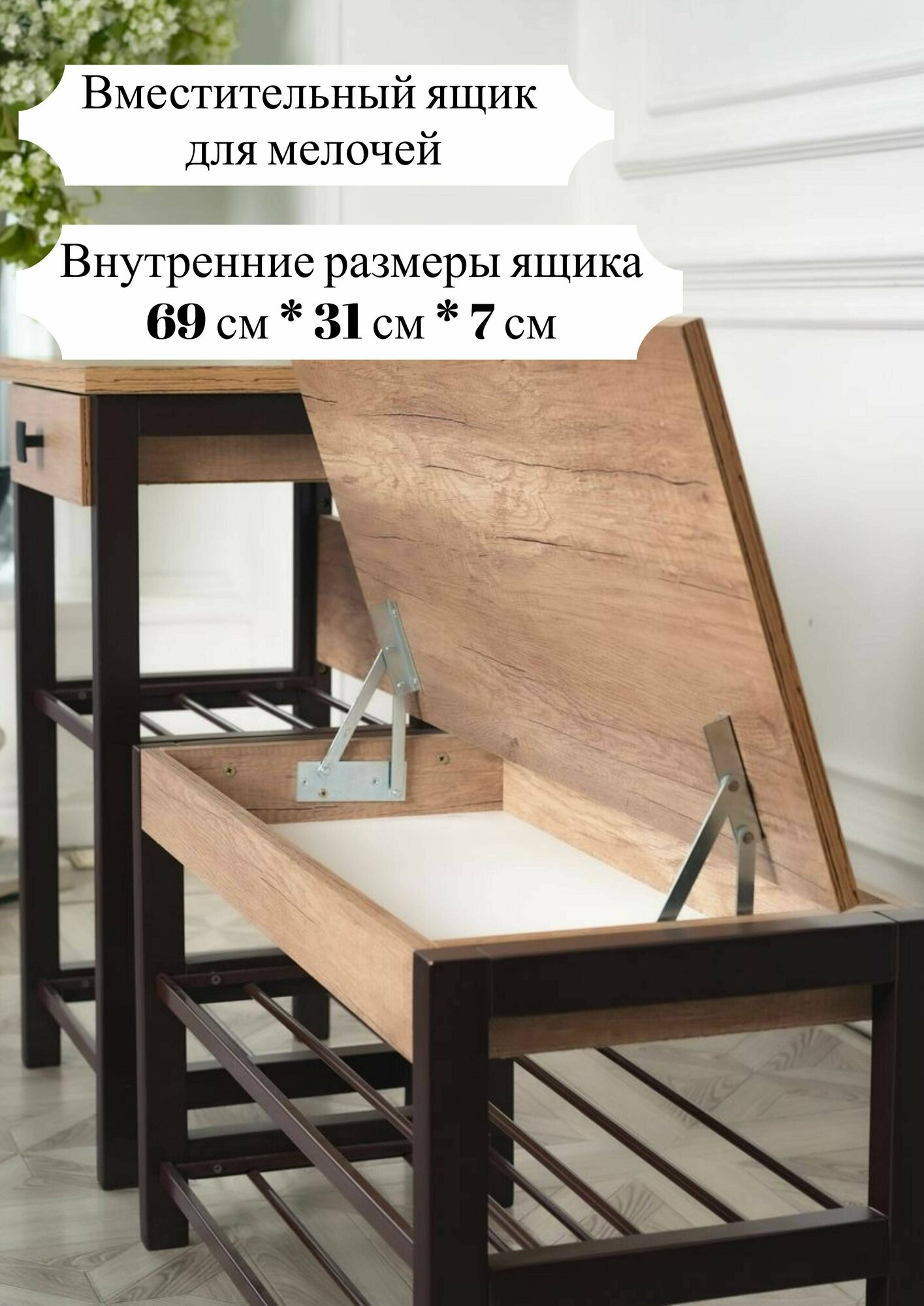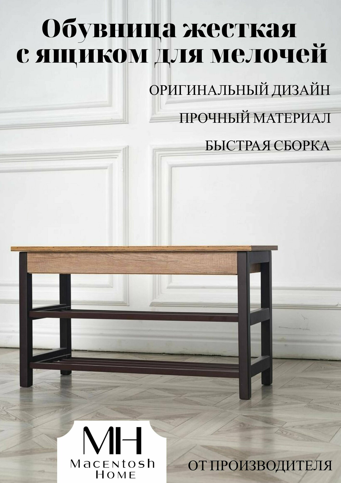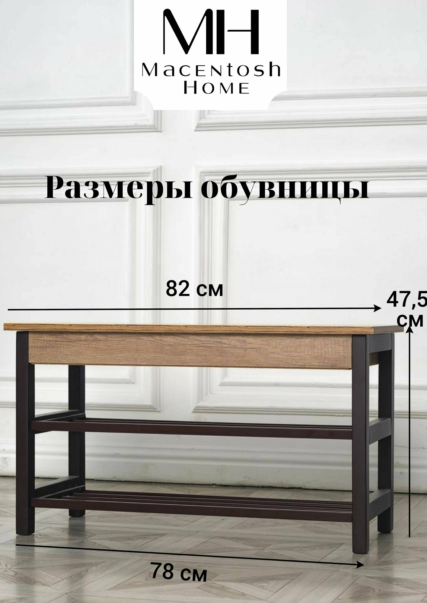 Обувница, этажерка для обуви с сиденьем, скамья или галошница - отличный вариант для хранения обуви и повседневных вещей, а также удобный варианта для коридора, чтобы присесть, снять обувь и расположить ее на металлические полки. В вместительный ящик для хранения можно поместить аксессуары для обуви, зонт, ключи и любую другую мелочь. Компактные форма и размеры позволяют поставить обувницу не только в прихожей, но и в узком коридоре и на балконе, а также в гардеробной комнате и холле. Металлические полки для обуви это незаменимый предмет интерьера в квартире, в бане или на даче, который можно использовать в качестве банкетки, пуфика с ящиком для хранения в коридоре мелочей, документов, средств для ухода за обувью. Прочное сиденье у открытой обувницы обеспечит вам комфортное переобувание в гардеробной. Наши изделия подходят для интерьеров стиле лофт, классическом, современном, модерн. Полочки для обуви из металла с антикоррозионной порошковой покраской с защитой от влаги белого цвета и коричневого цвета представлены в трех цветах. Так же у нас вы можете приобрести в комплект и другую деревянную мебель в прихожую: зеркало настенное, тумбу узкую, тумбу комод в прихожую под обувь (для обуви подставка) без мягкого сиденья, напольная вешалка, навесную вешалку. И у вас получится роскошный комплект в прихожую, но в современном стиле минимализм, лофт. Станет отличным подарком маме, папе, бабушке, дедушке, свекрови, другу и подруге на новоселье, день рожденье, или без повода порадовать дорогих людей. Наши изделия подходят для интерьеров стиле лофт, классическом, современном, модерн, минимализм. Ножки у обувницы выполнены из бука, полки из металла, ящик и жесткая сидушка из качественного ЛДСП. Обувница с сиденьем из ЛДСП имеет следующие размеры: длина 820 мм, ширина 475 мм, глубина 370 мм. Обувница с ящиком приходит в разобранном виде, но благодаря инструкции и всем необходимым креплениям ее очень легко собрать. С такой обувницей любая прихожая станет стильной, незабываемой. Кроме того, наша мебель прослужит Вам долго благодаря нашему особому подходу при создании и производстве мебели только из натуральных и качественных компонентов, чтобы дизайн и функциональность изделий были на высшем уровне по доступной цене. Наша мебельная фабрика и бренд Macentosh Home станет лучшим другом и приятным дополнением к Вашему дому.