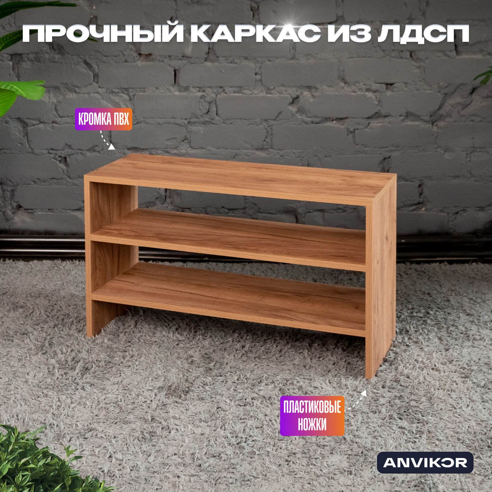 Обувница в прихожую «Окана» создаст гармонию и порядок в прихожей, гардеробной или коридоре. На компактной конструкции с двумя вместительными полками можно разместить до 9 пар обуви без ущерба для свободного пространства, что особенно подойдет для небольших помещений. Максимальная нагрузка — до 25 кг. На верхнюю полку изделия можно положить зонт, сумку, ключи. Открытая система хранения позволяет быстро найти нужную пару обуви. Прочный каркас из ламинированной ДСП и кромка из ПВХ делают изделие надежным и долговечным. Пластиковые заглушки защищают напольное покрытие от царапин и вмятин. Обувница в прихожую не только функциональна, но и эстетически привлекательна. Обувница открытого типа впишется в любой интерьер дома, дачи, офиса, салона красоты, медицинского или косметологического кабинета. Благодаря универсальному дизайнерскому решению изделие легко сочетается с другими предметами мебели. Сборка обувницы не занимает много времени. В комплекте с ней поставляется подробная инструкция.