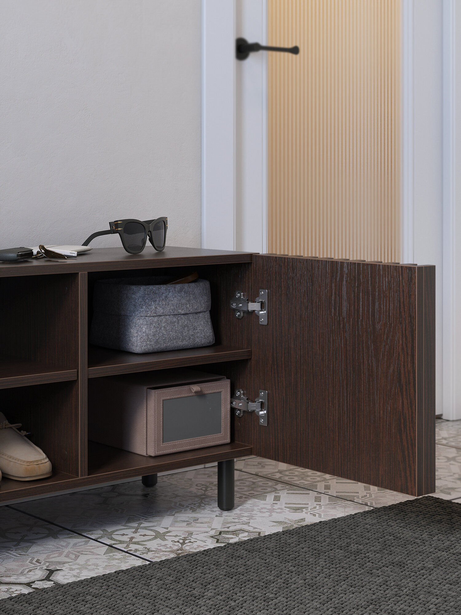 Обувница оснащена четырьмя отделениями для размещения различных видов обуви. Это позволяет эффективно использовать пространство и упорядочивать обувь.