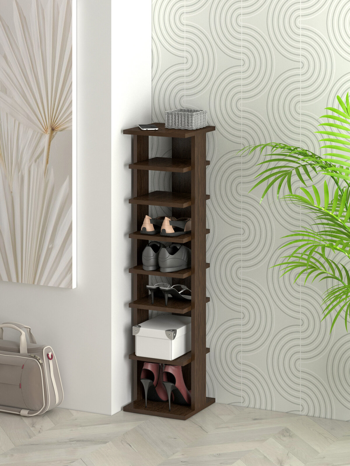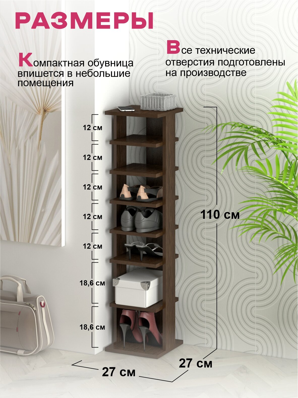 Компактные размеры (110х27х27 см) позволяют разместить обувницу в помещениях с ограниченным пространством. У этажерки семь полок, две для сапог и пять для низкой обуви. Такой стеллаж для обуви отлично подходит не только для дома, но и для дачи или даже офиса. Легкий доступ к вашим любимым туфлям и ботинкам делает повседневное использование комфортным и удобным.