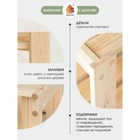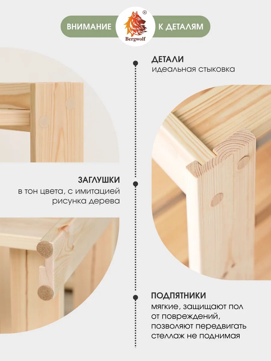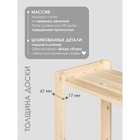 Изготовлена из массива молодой сосны из северных регионов страны, которая известна своей твёрдостью и плотной фактурой. Обувница прослужит долгие годы также благодаря крепкой конструкции на евровинтах. Каждая полка способна выдержать нагрузку до 50 кг.