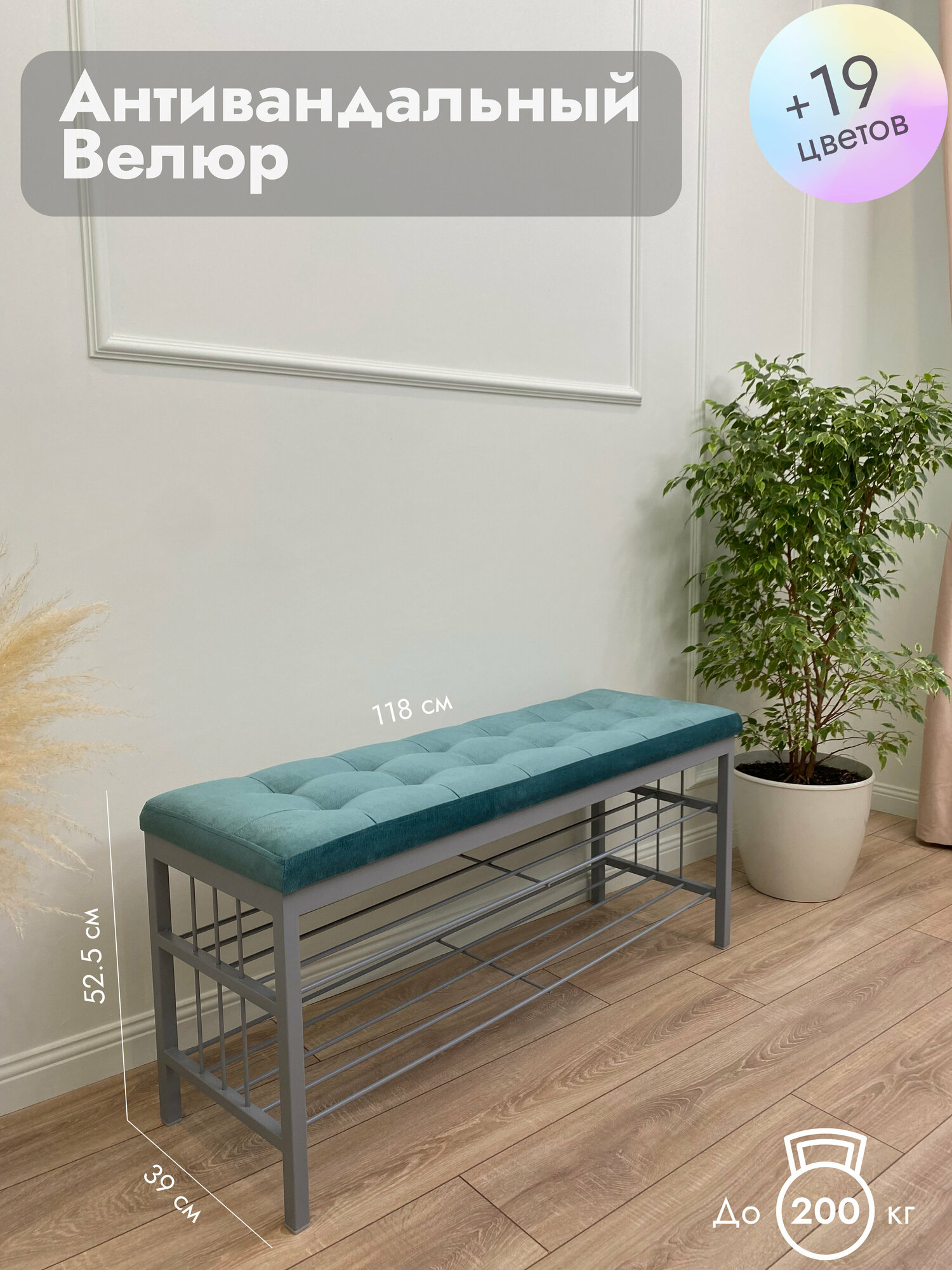 Обувница в прихожую Сканди с двумя полками ( высота 52 с половиной длина 118 глубина 39 ) выполнена из цельносварного металлического каркаса с полимерно - порошковым покрытием, что позволяет использовать ее длительное время. Металлическая этажерка имеет полки для хранения обуви, которые изготовлены из калиброванных прутьев диаметром 8 мм, что гарантирует их надежность от провисания. Мягкое сиденье и прочная основа ДСП 16 мм, покрыто поролоном 40 мм и обтянуто износостойким антивандальным велюром. Отгружается в собранном виде. Вес изделия 15 кг. Вес в упаковке 17.2 кг. Открытая обувница для прихожей коридора балкона вместит в себя минимум 10 пар обуви на полках + 5 под полочками. Большой выбор цветов, как каркаса (черный белый), так и сидушек. Отличный подарок на новоселье. Сделано в России.
