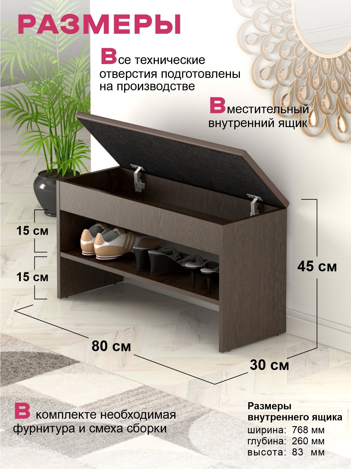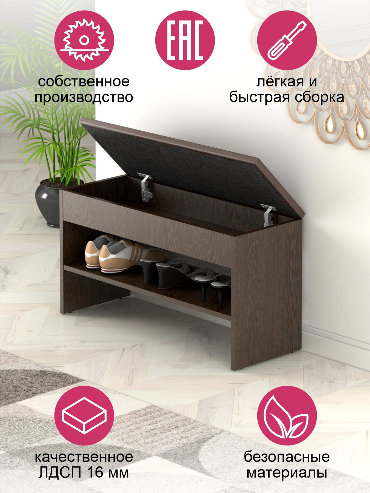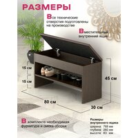 Обувница с сиденьем изготовленная из качественных материалов. Обувница надежна и долговечна. Ее компактный размер позволяет использовать ее даже в небольших прихожих, при этом обеспечивая достаточное пространство для хранения обуви. Благодаря ламинированной отделке, модель выглядит современно и легко вписывается в любой интерьер, будь то классический или минималистичный стиль.