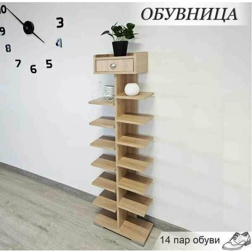 Обувница деревянная — незаменимый предмет мебели для благоустройства входной зоны. Благодаря компактной форме полка для обуви высокая не занимает много места. В конструкции изделия предусмотрены полки и ящик для мелочей. Стильное цветовое исполнение и простота форм позволяют вписать этот предмет мебели в практически любой интерьер. Стеллаж для обуви высокий в прихожую порадует Вас качеством и функциональностью! Этажерка деревянная вмещает 14 пар обуви и оснащена ящиком для мелочей.