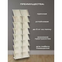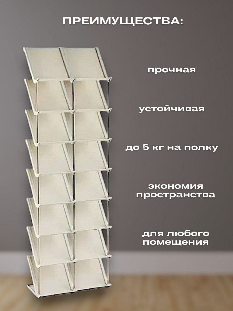Отличный вариант вертикального напольного хранения обуви в доме! Это стильная и функциональная стойка для обуви. Легко расположится в комнате или спальне, коридоре или на балконе, в кладовой или гостиной. Засчет своей компактности отлично войдет в шкаф. Этажерка открытая и состоит из 6 пластиковых полок и металлических трубок. Достаточно устойчива. Выдерживает большую нагрузку. Легко собирается. Большое преимущество в том, что из одной Вы можете собрать две, а если приобрести еще одну, то Вы сможете собрать еще больше и в разных вариациях. Данный стеллаж подойдет не только для кроссовок, тапочек , туфлей, но и для сапог.