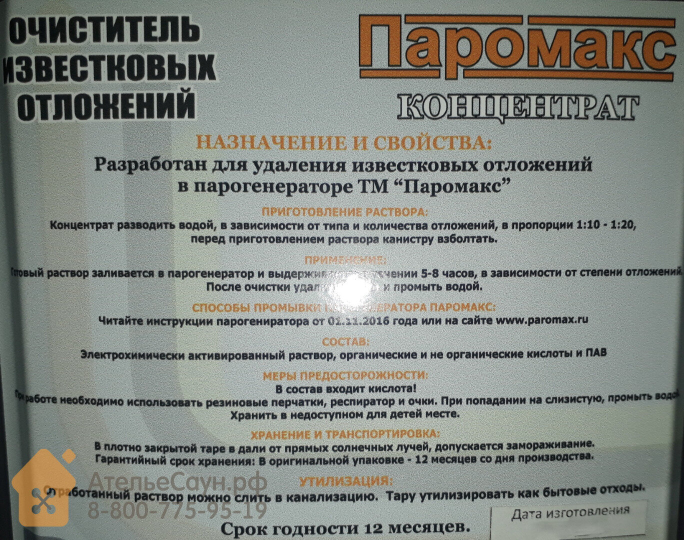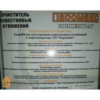 Очиститель от накипи Паромакс 10 л станет на защиту ТЭНов и бойлеров. Он обеспечит их стабильную и продолжительную эксплуатацию, удалив всю накипь и коррозию. Всё это появляется в результате загрязнённости воды всевозможными химическими веществами. Именно они постепенно откладываются на поверхности нагревателей, препятствуя их теплопроводимости и увеличивая расход электроэнергии необходимой для полноценного нагрева. Для того, чтобы избавиться от этого неприятного эффекта, нужно всего лишь залить данное средство в нужную ёмкость и запустить автоматическую промывку парогенератора. Приготовление раствора: Концентрат разводить водой, в зависимости от типа и количества отложений, в пропорции 1:10 – 1:20, перед приготовление раствора канистру взболтать. Применение: Готовый раствор заливается в парогенератор и выдерживается в течении 5-8 часов, в зависимости от степени отложений. После очистки удалить шлаки и промыть водой. Состав: Элекрохимически активированный раствор, органические и неорганические кислоты и ПАВ. Меры предосторожности: В состав входит кислота! При работе необходимо использовать резиновые перчатки, респиратор и очки. При попадании на слизистую, промыть водой. Хранить в недоступном для детей месте. Технические характеристики очистителя от накипи Паромакс: