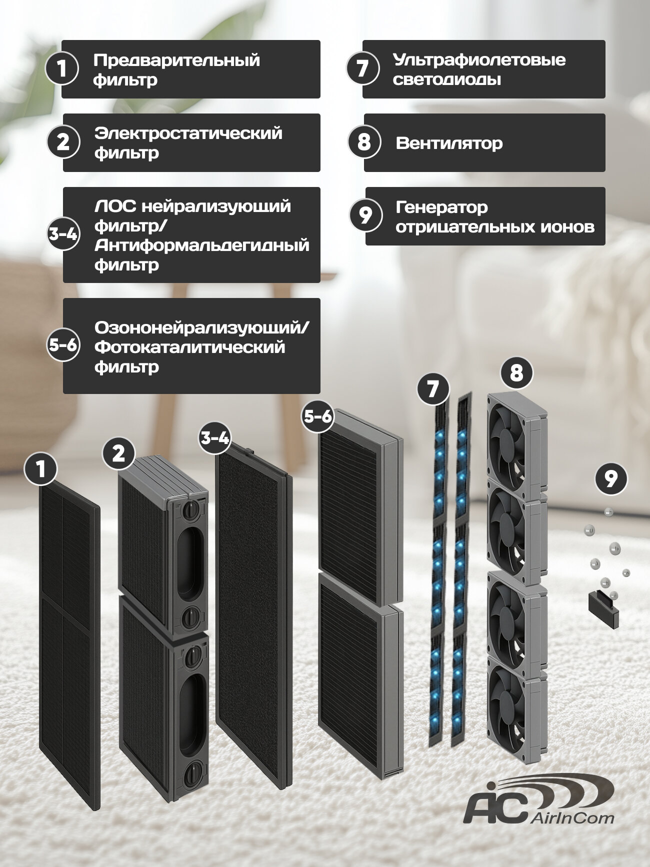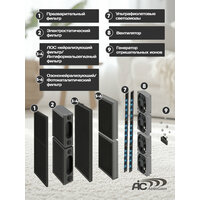 Устройство для очистки воздуха AIC XJ-4600 представляетсобой воздухоочиститель, предназначенный для очистки воздуха в помещении отразличных загрязнений, таких как пыль, аллергены, запахи, масляные взвеси, табачный дым, гарь, аэрозоли и мельчайшие пылевые частицы. Уникальность устройства заключается в восьмиступенчатойсистеме очистки, каждая их которых имеет многолетний ресурс и не требует заменычерез какой-либо промежуток времени! Воздухоочиститель снабжён четырьмянезависимыми вентиляторами, что увеличивает его возможности по воздухообмену и, соответственно, обслуживаемой площади помещения. При максимальном потреблении30 Вт, устройство способно очищать до 120 м2. Назначение устройства: Устройство для очистки воздуха AIC XJ-4600 может бытьиспользовано в местах общего пользования, офисах, серверных, небольшихпроизводственных (с неагрессивной средой) и коммерческих помещениях. Функции и отличительные особенности прибора: -Высокопроизводительный вентилятор постоянного тока. -Восемь степеней очистки. -Низкое энергопотребление. -Ночной режим работы. -Автоматический режим. -Плазменная (электростатическая) технология очистки воздуха. -Фотокаталитическая система очистки воздуха. -Стерилизация и антисептическое воздействие ультрафиолета. -Фильтры, не требующие замены. -Эффективная фильтрация частиц от 0,1 до 0,3 мкм. -Эффективное удаление пыли, запахов и табачного дыма. -Генерация отрицательных ионов. -Встроенный таймер. -Датчик очистки фильтров. -Цветовой индикатор качества воздуха. -Четыре режима настройки производительности. -Оперативное удаление вредных газов, таких как ацетон, бензол и т. п. -Для удобства перемещения в комплект входят колёсики. Фильтр предварительной очистки. Задерживает наиболее крупные частицы, такие как волосы, перхоть, шерсть, бытовая пыль, содержащиеся в воздухе. Электростатический (плазменный) фильтр. Электростатическая фильтрация воздуха основана на принципепритяжения разнополярных зарядов. Частицы дыма, пыли, гари, различныхорганических соединений, проходя через фильтр, приобретают электрический заряди притягиваются к токопроводящим пластинам с противоположной полярностью. Приработе плазменного фильтра вырабатывается озон, который разрушает такие вредныевещества, как формальдегиды, бензолы, фенолы, цианиды, сульфиты, хлорамины ипрочие. ЛОС нейтрализующий фильтр. ЛОС (летучие органические соединения) – это токсичныехимические вещества, выделяемые в виде газов из различных бытовых товаров, например, таких как: краска, ковровое покрытие, копировальные аппараты ипринтеры, мебель из ДСП, консерванты для дерева, растворители для краски, клеи, лаки, перманентные маркеры, косметика, бензин, чистящие жидкости, дезинфицирующие средства, стиральные порошки, некоторые аэрозоли и пластмассы. Они представляют серьезную опасность для здоровья. Через легкие и кожу онипопадают в кровь, накапливаются в организме человека, вызывая аллергии и другиеболезни. ЛОС нейтрализующий фильтр эффективно удаляет из воздухабольшинство вредных летучих органических соединений, таких как бензол, этилен, ксилол, стирол, толуол, ацетон и т. д. Антиформальдегидный фильтр. Фильтр содержит комбинацию веществ, предназначенную дляудаления формальдегида, неприятных запахов и других опасных химических веществиз воздуха в помещ