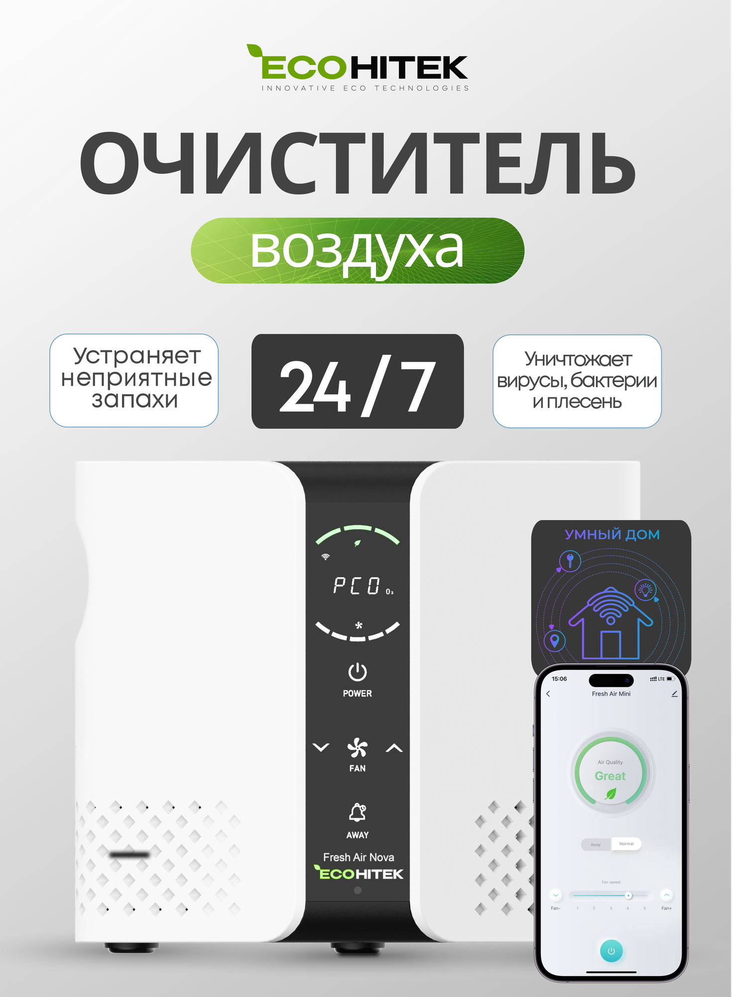 Воздухоочиститель с функцией умного дома Fresh Air Nova от EcoHitek — очиститель воздуха с фотокаталитической очисткой, озонированием и биполярной ионизацией устраняет любые запахи, очищает воздух от пыли и вредных микроорганизмов.