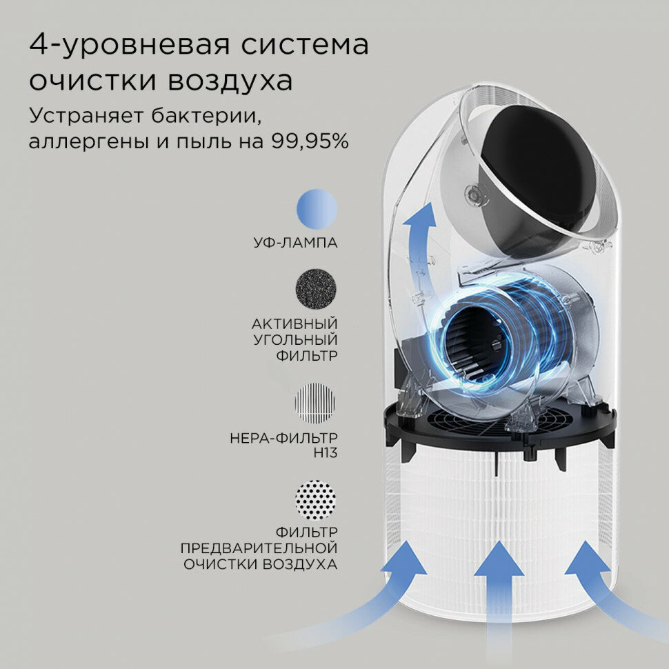 Очиститель оснащен системой из УФ-лампы и 3 фильтров: