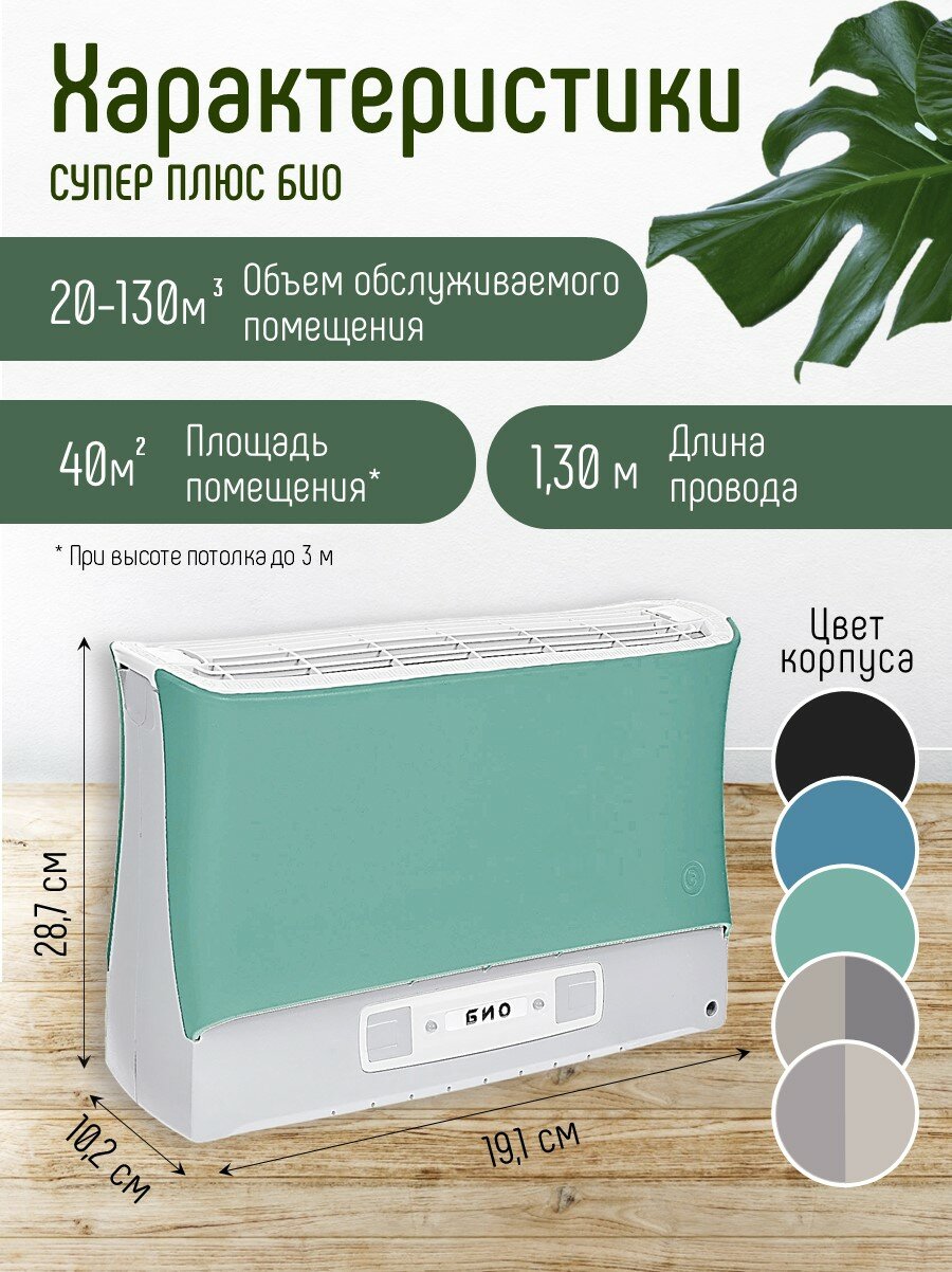 Воздух, проходящий через кассету ионизатора-воздухоочистителя Супер Плюс Био, дополнительно обрабатывается озоном, образующимся в зоне коронного разряда, его количество заметно меньше предельно допустимой концентрации, но все же достаточно для того, чтобы в помещении, в котором работает прибор, уничтожались неприятные запахи, подавлялась жизнедеятельность болезнетворных микробов, спор грибков, плесени.