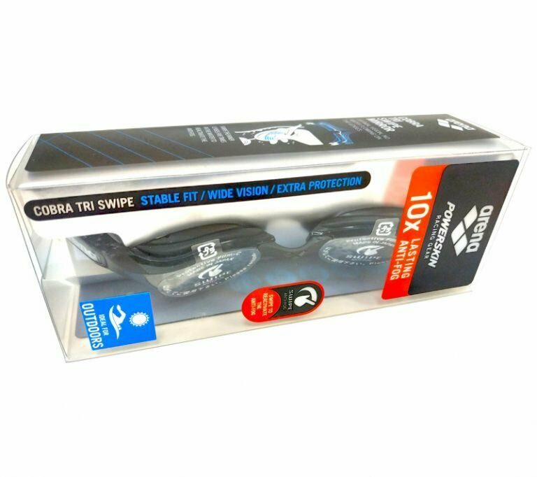 Профессиональные очки для плавания Cobra Tri Swipe Mirror — новинка в линейке Cobra. Cobra Tri Swip отличается от предыдущих моделей серии Cobra как обновленным дизайном, так и измененными характеристиками. Эти очки разработаны специально для профессиональных спортсменов, занимающихся скоростным плаванием и триатлоном. У этой модели сверхширокие низкопрофильные линзы, удлиненные в боковой части, благодаря которым достигается отличный периферический и фронтальный обзор. Линзы выполнены из твердого, стойкого к царапинам поликарбоната. Покрытие антифог препятствует запотеванию. Зеркальное напыление надёжно защищает глаза от яркого света. Благодаря этому очки могут использоваться как в бассейне, так и на открытой воде. Очки отличаются улучшенной посадкой за счёт использования мягкого и тонкого 3D-уплотнителя, благодаря которому достигается комфортное прилегание. Cobra Tri Mirror имеет обновлённое крепление. Прочный и эластичный силиконовый ремешок регулируется по длине с помощью боковой клипсы, в затылочной части он раздвоен для лучшего обхвата головы и более надежной фиксации. Сменная переносица также сама регулируется, что улучшает посадку и повышает комфорт при плавании в этих очках.