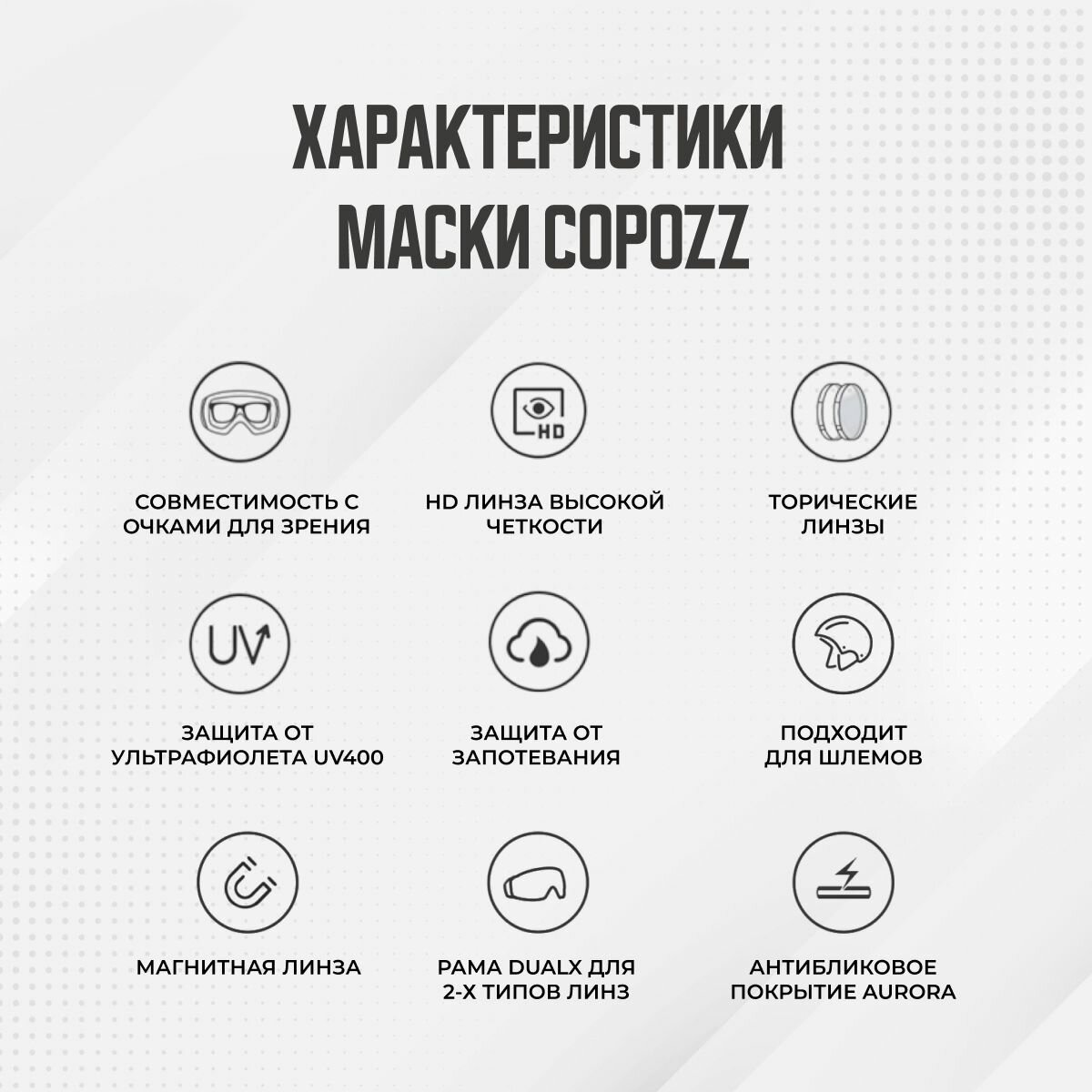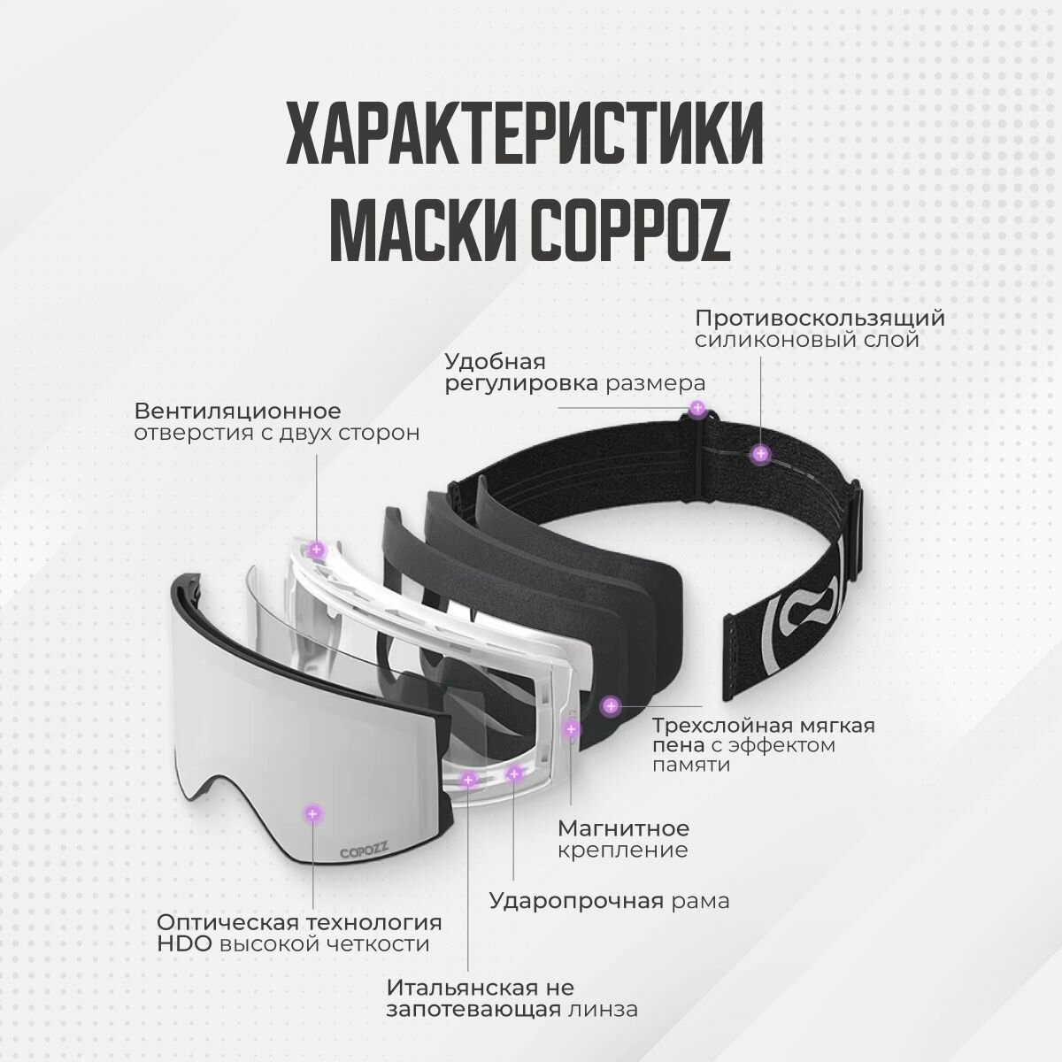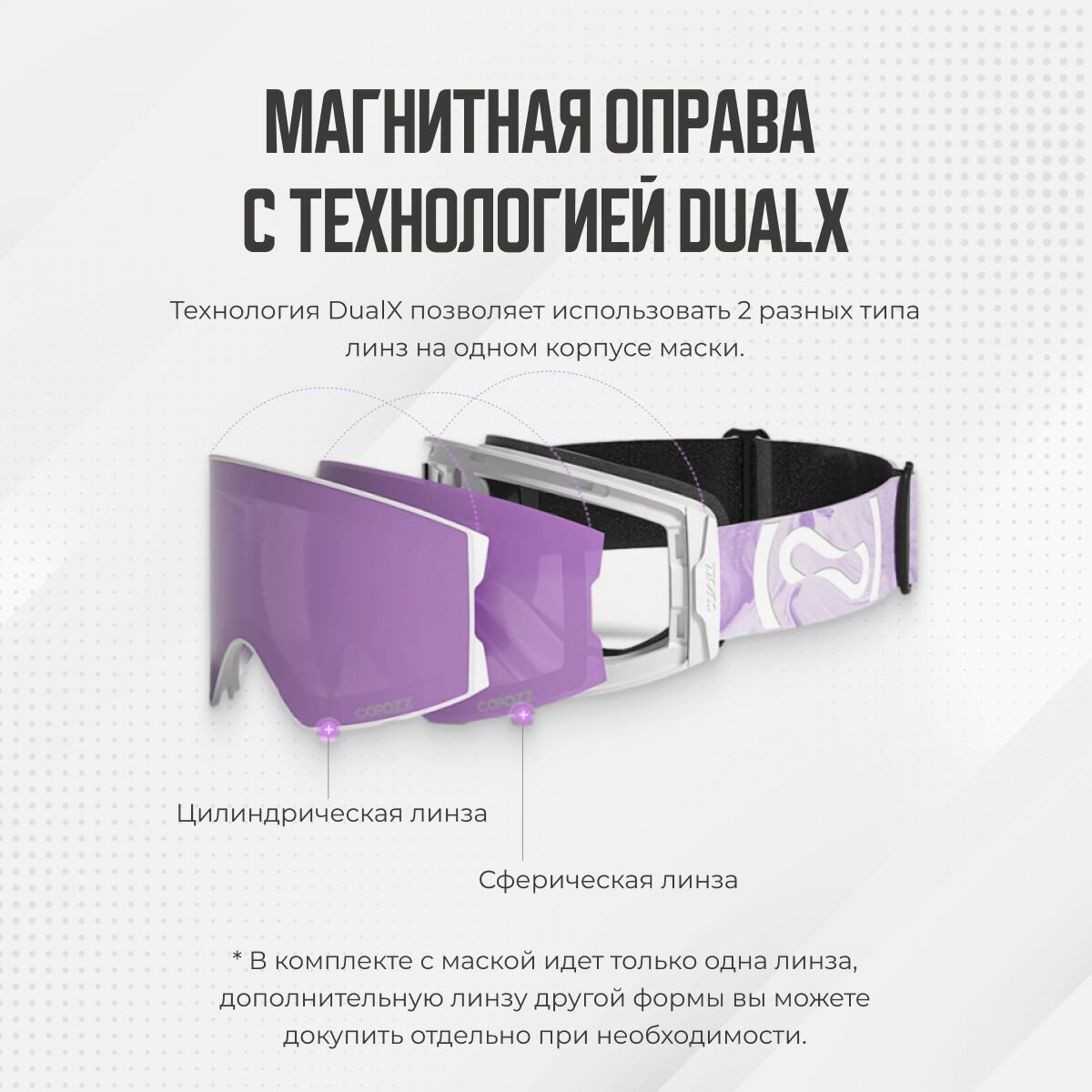 Представляем вашему вниманию стильные горнолыжные очки, предназначенные для активного отдыха на склонах – сноубордическую маску COPOZZ GOG 22100. Эти очки идеально подходят как для мужчин, так и для женщин, гарантируя максимальный комфорт и защиту во время катания. Маска горнолыжная обладает прочной и качественной конструкцией, которая обеспечит надежную защиту ваших глаз от солнечных лучей, ветра и снега. Ультрафиолетовая защита и антифоговые свойства гарантируют отличную видимость в любых условиях, позволяя сосредоточиться на вашем спуске без потери контроля и комфорта. Благодаря магнетической системе крепления линз, замена линз становится простой и быстрой. Вы сможете легко адаптировать маску под разные погодные условия, меняя линзы на более светлые для пасмурной погоды или на затемненные для яркого солнечного дня. Кроме этого, очки удобно сидят на лице благодаря регулируемому ремешку, что делает их универсальными для любого шлема. Эта модель – отличное решение для тех, кто любит активные зимние виды спорта. Как бы вы ни катались – на сноуборде или лыжах – ваши глаза будут в безопасности. Очки горнолыжные COPOZZ GOG 22100 подойдут для зимних приключений на снегоходе, обеспечивая оптимальную защиту и стильный внешний вид. Если вы ищете качественные и многофункциональные очки для горнолыжных курортов, обратите внимание на эту модель.