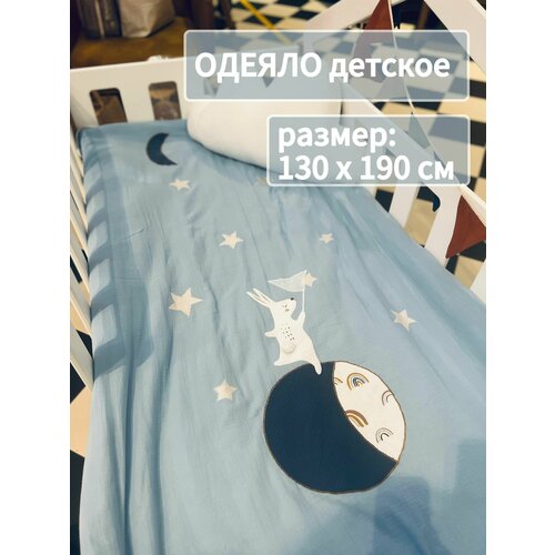 - Изготовлено из нежнейшего муслина (100% хлопок). С лицевой стороны аппликации выполнены на нежно-голубом муслине, с оборотной стороны - стёжка из муслина с радугами.