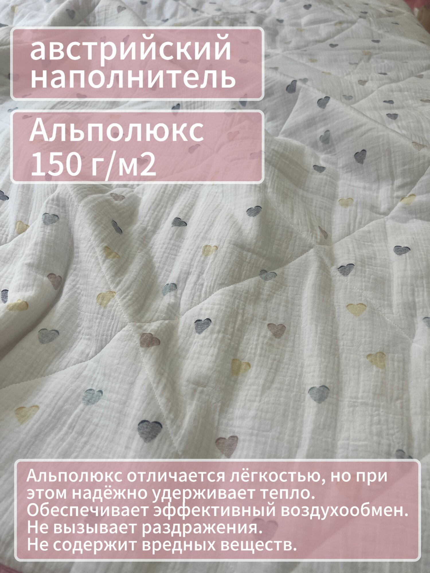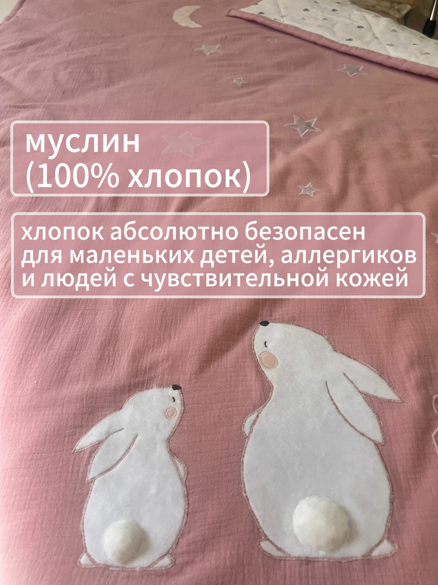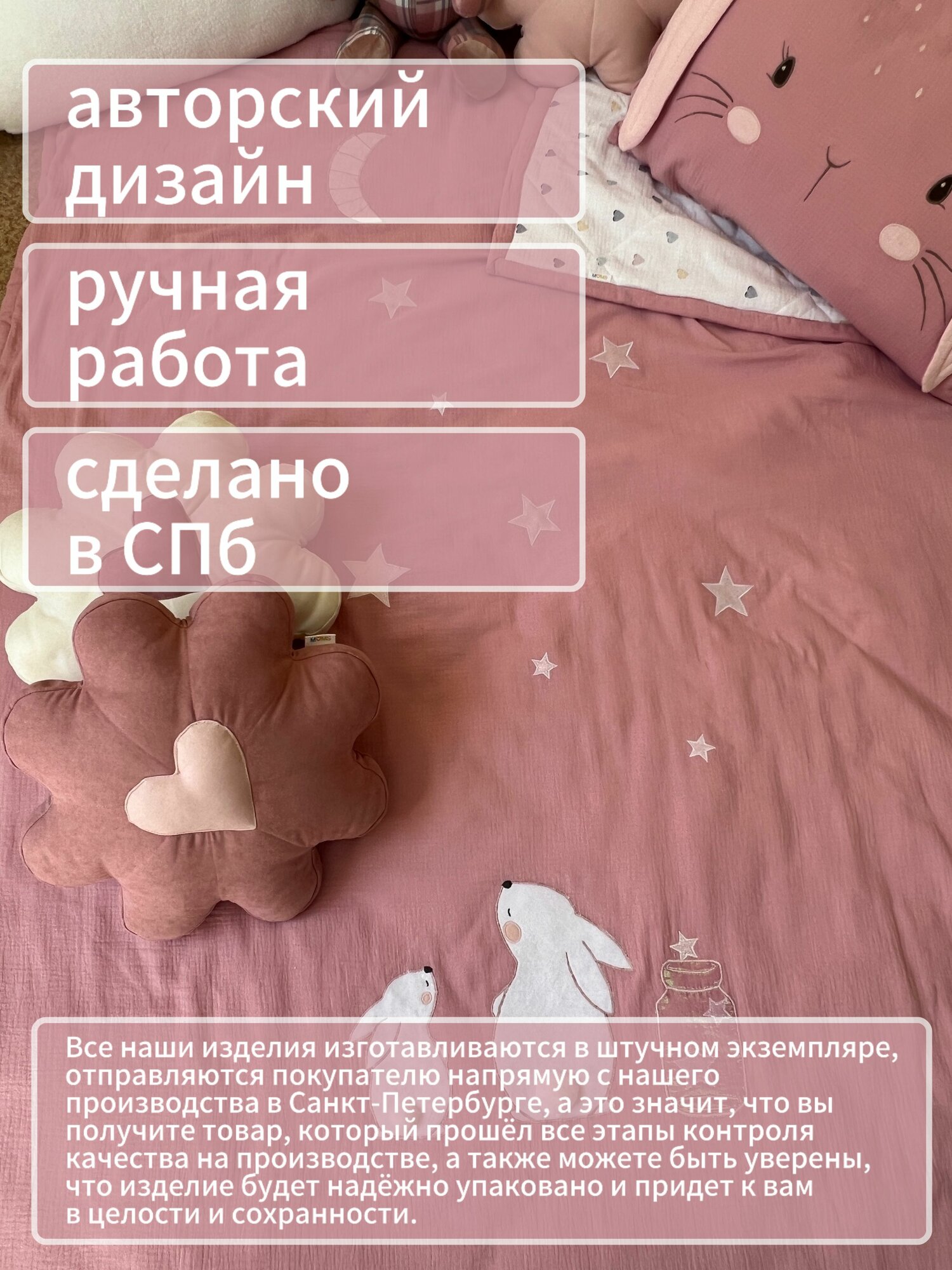 - Изготовлено из нежнейшего муслина (100% хлопок). С лицевой стороны аппликации выполнены на пыльно-розовом муслине, с оборотной стороны - стёжка из муслина с сердечками.