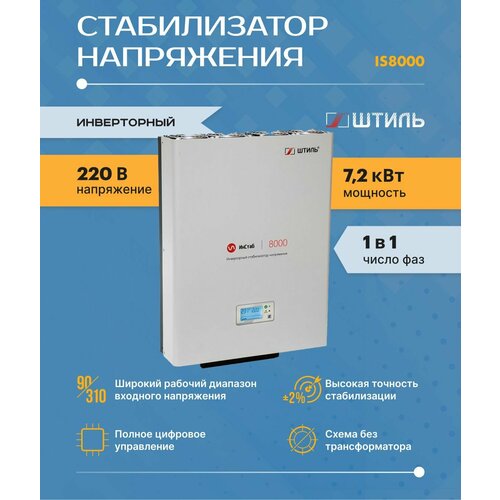 Однофазный инверторный стабилизатор напряжения IS8000 разработан специально для российских сетей и предназначен для защиты от нестабильного напряжения отдельных приборов или группы оборудования суммарной потребляемой мощностью до 8 кВА/ 7,2 кВт, в частности: