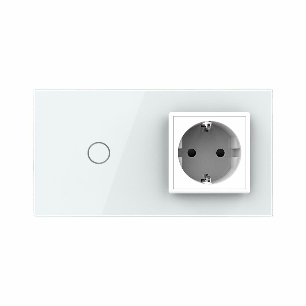 Одноклавишный сенсорный выключатель Livolo с розеткой белый на 2 поста для управления одной линией нагрузки (ВКЛ/выкл). Чувствительный сенсор, моментальное включение. При переключении издаётся лёгкий щелчок. Подсветка клавиш светится синим при выключенном свете, красным при включённом. Переделывать проводку не нужно (только фазный провод, без нуля). Работает со всеми типами ламп. Максимальная нагрузка 1000 Ватт на клавишу. Для корректной работы с лампами мощностью менее 5 Ватт может потребоваться адаптер для маломощных ламп.