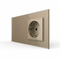 Одноклавишный сенсорный выключатель Livolo с розеткой золотой на 2 поста для управления одной линией нагрузки (ВКЛ/выкл). Чувствительный сенсор, моментальное включение. При переключении издаётся лёгкий щелчок. Подсветка клавиш светится синим при выключенном свете, красным при включённом. Переделывать проводку не нужно (только фазный провод, без нуля). Работает со всеми типами ламп. Максимальная нагрузка 1000 Ватт на клавишу. Для корректной работы с лампами мощностью менее 5 Ватт может потребоваться адаптер для маломощных ламп.