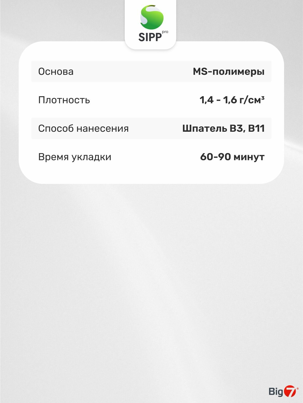 SIPP 1K MS — профессиональный однокомпонентный эластичный клей на основе MS-полимеров для надёжного монтажа всех видов деревянных напольных покрытий. Идеально подходит для массивной и инженерной доски, штучного паркета, фанеры и других оснований, включая системы с подогревом пола.