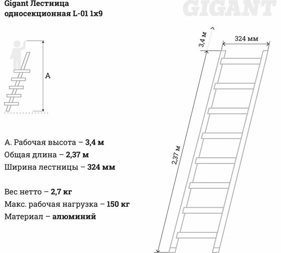 Купить Односекционная лестница 9 ступеней Gigant L-01 1х9 с доставкой по всей России. Односекционная лестница 9 ступеней Gigant L-01 1х9: сравнение цен, характеристики, фото, актуальное наличие и цены.