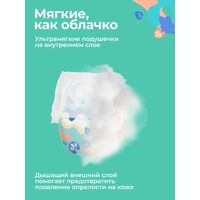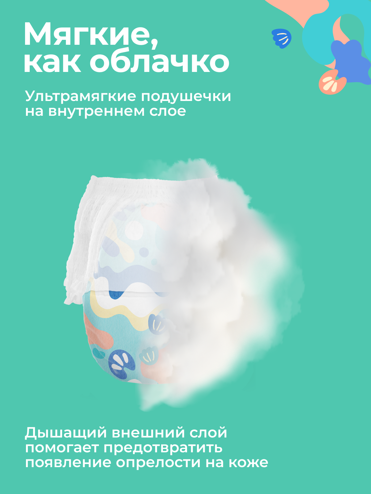 боковые внутренние бортики, многоразовые застежки-липучки, рельефная внутренняя поверхность, эко-подгузники, эластичные резинки вокруг ножек, эластичный пояс