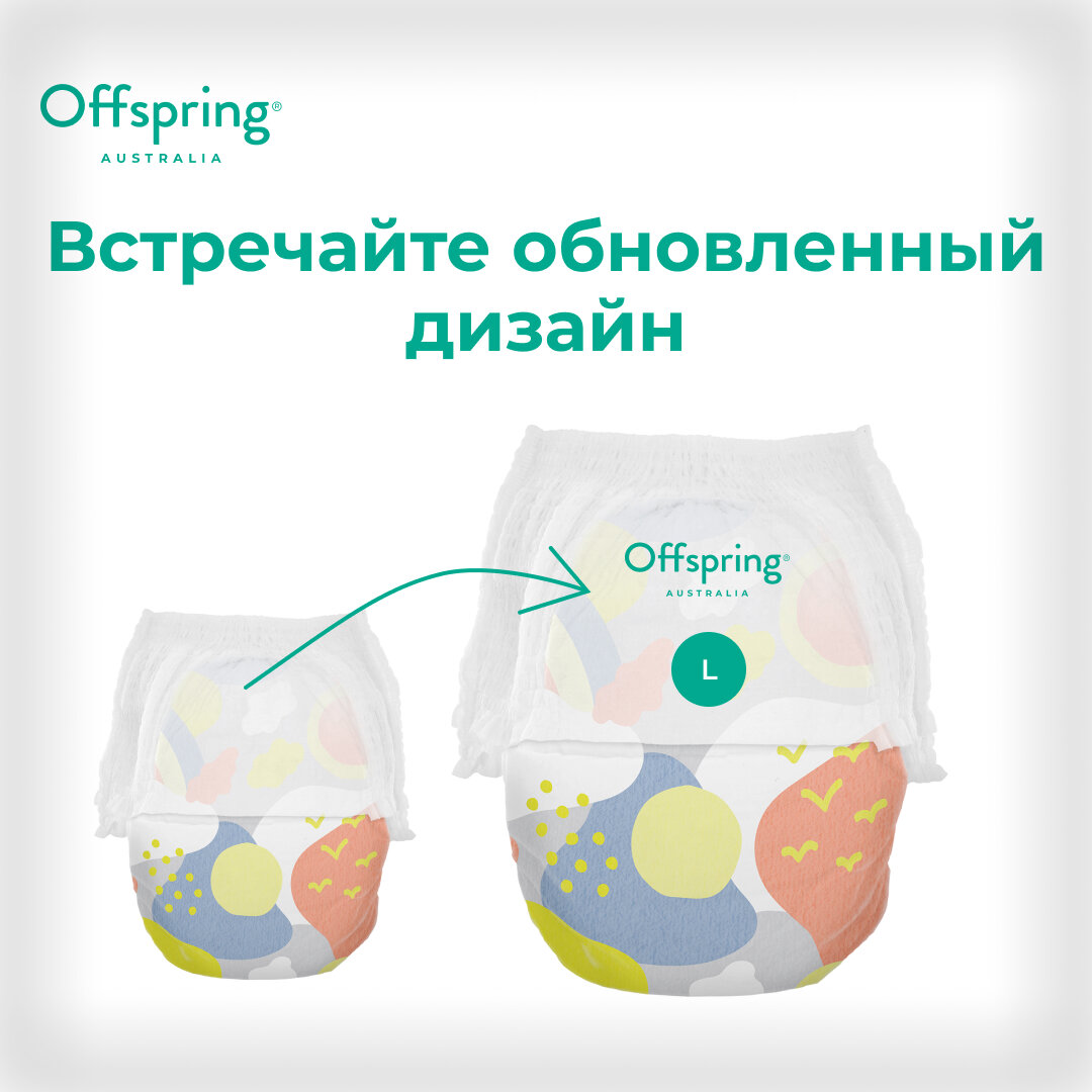 Offspring трусики-подгузники, L 9-14 кг. 36 шт. расцветка Небо: сравнение цен, характеристики, фото, актуальное наличие и цены.