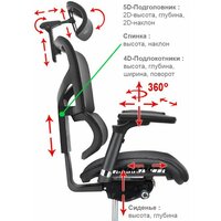 высоты подголовника, высоты подлокотников, высоты сиденья, высоты спинки, глубины положения подлокотников, глубины сиденья, жесткости качания, наклона спинки, расстояния между правым и левым подлокотником, угла наклона подголовника, угла подлокотников