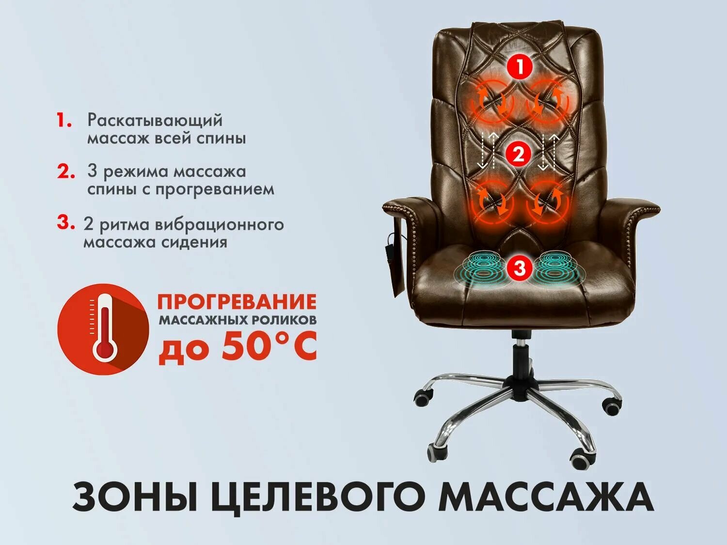 Полностью русифицированная инструкция и пульт управления с новым дизайном Обновленная серия офисных кресел с массажем EGO PRIME Обеспечивает пользователю комфорт и удобство за рабочим местом Разработано совместно с компанией ОТО (Сингапур) Кресло имеет отличную поддержку спины и удобные подлокотники Дополнительная накидка быстро откидывается при выполнении массажа Пять вариантов массажной терапией с возможностью прогрева Расширенные возможности настройки массажного механизма вдоль спины Кресло может быть зафиксировано в наклонном положении для лучшего воздействия Усиленный механизм раскачивания, типа TOP GUN LUX Материал обивки выполнен из искусственной кожи АРПАТЕК Удобные широкие ручки подлокотников с декоративной бронзовой отделкой , Усиленный газовый патрон (газ-лифт) Специальные колеса опоры с прорезиненным слоем Стальная крестовина с хромированным покрытием Увеличенная максимальная нагрузка на кресло 130кг Посмотреть полное описание товара