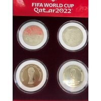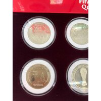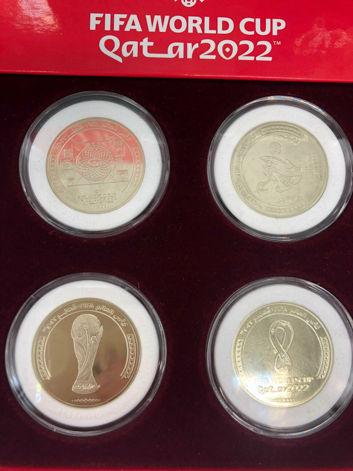 Аверс: в центре изображена карта Катара, вокруг которой указаны названия стран-чемпионов мира, что посетили и данный чемпионат в качестве участников: "URUGUAY ITALY GERMANY ENGLAND ARGENTINA FRANCE SPAIN". Внизу по центру отчеканена надпись "FIFA WORLD CUP / QATAR 2022". В верхней части, по окружности, на арабском языке указано название монеты: .