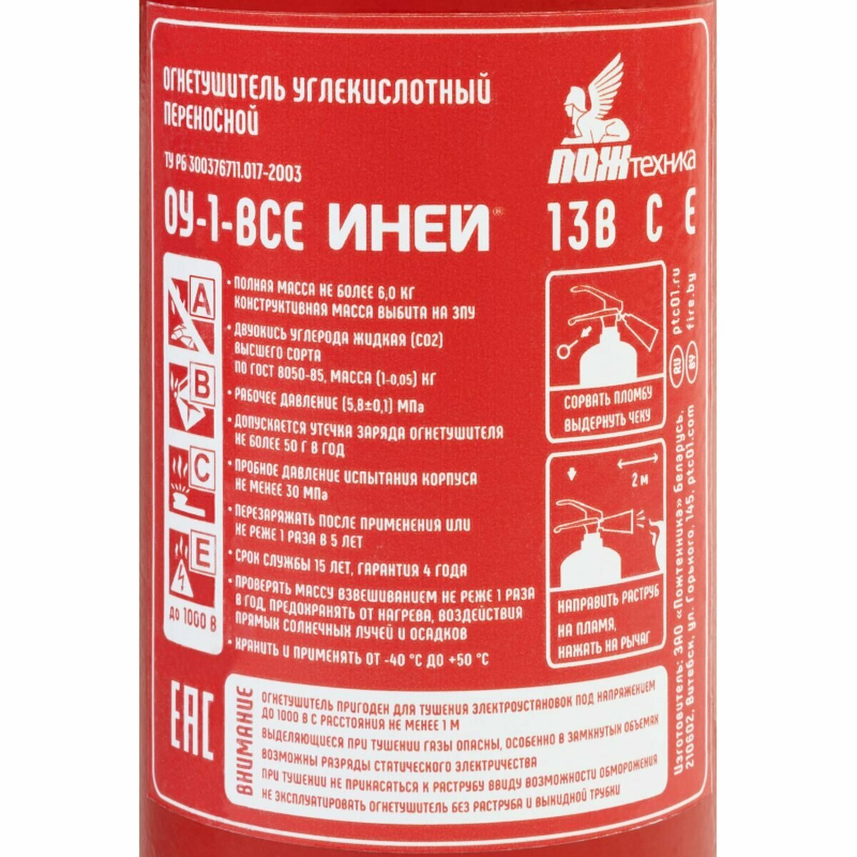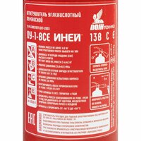 Огнетушитель углекислотный компактного ОУ-1 класса предназначен для тушения легковоспламеняющихся жидкостей и газов, твердых нетлеющих материалов, электрооборудования до 1кВ. Назначение Огнетушители углекислотные ОУ-1-ВСЕ иней предназначены для оснащения органов и подразделений по чрезвычайным ситуациям, защиты объектов народного хозяйства, транспортных средств, а также для применения в бытовых условиях в качестве первичного средства тушения пожаров классов В (жидких веществ), С (газообразных веществ) и Е (электрооборудования, находящегося под напряжением до 1000В). Огнетушители не предназначены для тушения загораний щелочных, щелочноземельных металлов и других материалов, горение которых может происходить без доступа воздуха. Масса огнетушащего вещества ОУ-1-ВСЕ иней составляет 1 кг. Огнетушитель рассчитан на тушение объекта возгорания в течение 6 секунд при длине струи 2 метра. В комплект поставки огнетушителя входит:- огнетушитель - 1 шт, - распылитель - 1 шт, - руководство по эксплуатации - 1 шт. При получении огнетушителей в разобранном виде распылитель подсоединяется к запорно-пусковому устройству (ЗПУ) огнетушителя таким образом, чтобы обеспечивалась возможность установки распылителя в удобном для оператора положении и его надежная фиксация. Для размещения огнетушителей на транспортных средствах применяются кронштейны транспортные КТХ. Кронштейны транспортных КТХ в комплект поставки огнетушителей не входят и заказываются отдельно. Устройство и принцип работыОгнетушитель ОУ-1 состоит из корпуса, в горловину с резьбой W19,2 которого ввернуто ЗПУ с сифонной трубкой. К выходному отверстию ЗПУ с резьбой М16х1,5 огнетушителя ОУ-1, подсоединяется распылитель, состоящий из выкидной трубки и раструба. После удаления чеки и нажатия кистью руки на верхнюю ручку ЗПУ открывается клапан ЗПУ и огнетушащее вещество (двуокись углерода СО2), находящееся в огнетушителе под избыточным давлением, через сифонную трубку, ЗПУ и распылитель подается на очаг пожара. Для прекращения подачи ОТВ, верхнюю ручку ЗПУ следует вернуть в исходное положение. Порядок работы во время тушения пожара:1. Тушение очагов пожара на открытых площадках производить с наветренной стороны.2. При тушении струю ОТВ направлять в основание пламени.3. Во время тушения огнетушитель не должен отклоняться от вертикальной оси более чем на 30°.4. Тушение огнетушителями ОУ-1 электроустановок под напряжением до 1000 В производить с расстояния не менее 1 м от раструба огнетушителей до токоведущих частей. Указание о мерах безопасностиПри выходе ОТВ на раструбе возможно возникновение разрядов статического электричества. После применения огнетушителей в замкнутых объемах, помещения следует проветрить, т. к. при концентрациях более 5% (92 г/м3) двуокись углерода оказывает вредное воздействие на организм человека – снижается объемная доля кислорода воздухе, что может вызвать явление кислородной недостаточности и удушья. Огнетушители ОУ-1 пригодны для тушения пожаров электрооборудования под напряжением до 1000 В с расстояния не менее 1 м. Диапазон срабатывания мембраны предохранительного устройства ЗПУ от 18 МПа до 22 МПа. запрещается:- эксплуатировать огнетушители при появлении вмятин, вздутий или трещин на корпусе огнетушителя, на запорно-пусковом устройстве, а также при нарушени