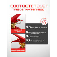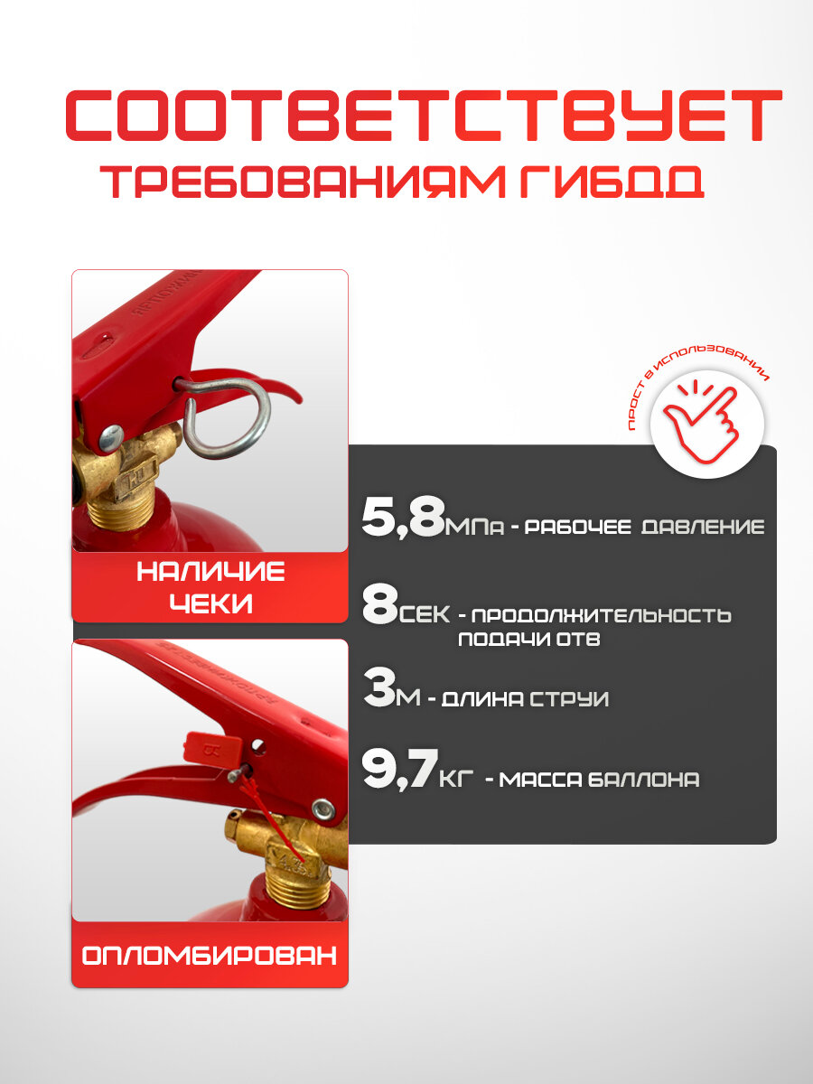 Технические характеристики: - масса заряда: 2,85 кг; - вместимость корпуса: 4,02 л; - масса огнетушителя: 9,4 кг; - длина выброса: 3 м; - продолжительность подачи огнетушащего вещества: 8,6 с; - огнетушащая способность: 34В; - габаритные размеры: 130х140х500 мм.