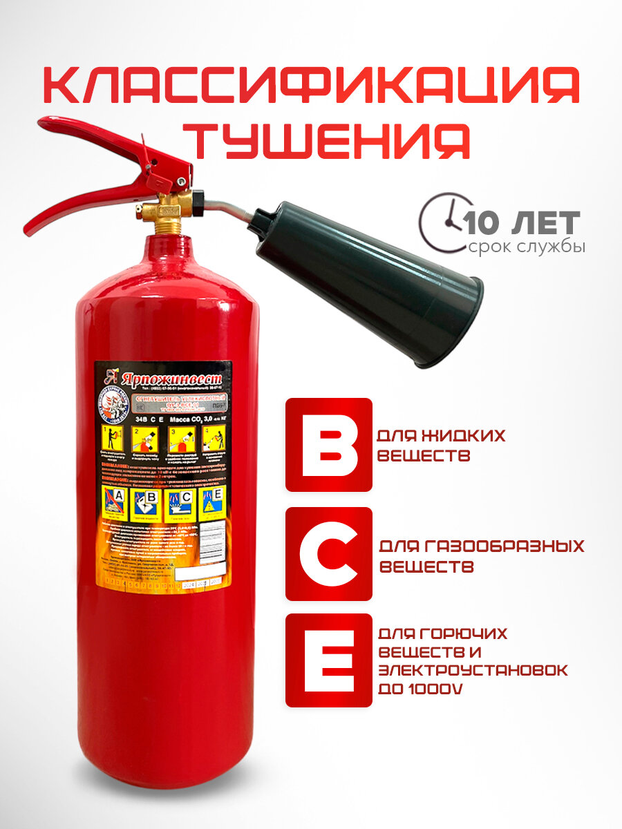 Огнетушитель Ярпожинвест ОУ-3 высокого давления с зарядом жидкой двуокиси углерода (ГОСТ 8050-85), находящейся под давлением насыщенных паров. Двуокись углерода не повреждает объект тушения и не оставляет следов. Корпус огнетушителя выполнен из стальной бесшовной горячекатаной трубы (ГОСТ 8731-74) и не имеет сварных швов. Углекислотные огнетушители предназначены для тушения различных веществ, горение которых не может происходить без доступа кислорода, загораний на электрифицированном железнодорожном и городском транспорте, электроустановок, находящихся под напряжением до 10 000 В, в офисных помещениях при наличии оргтехники, а также в жилом секторе.