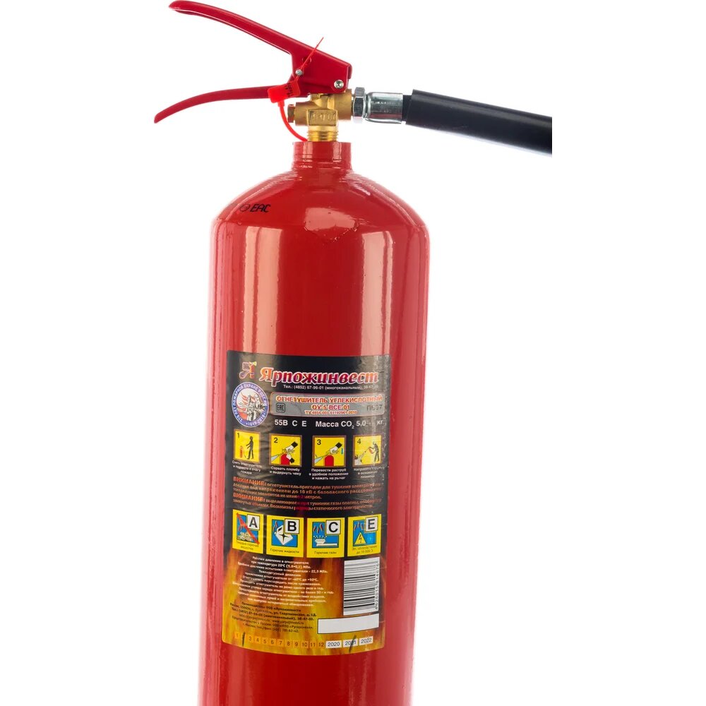 Огнетушитель углекислотный Ярпожинвест ОУ-5 ВСЕ – закачной огнетушитель высокого давления с зарядом жидкой двуокиси углерода (ГОСТ 8050-85), находящейся под давлением жидких паров. Применяется для первичного тушения пожаров и возгораний класса B, C, E (горючие и легковоспламеняющиеся жидкости, горючие газы, электроустановки, не превышающие напряжение 10000 Вольт). Основным преимуществом углекислотного огнетушителя является то, что двуокись углерода не повреждает объект тушения и не оставляет следов. Внимание, изображение товара может отличаться от реального!
